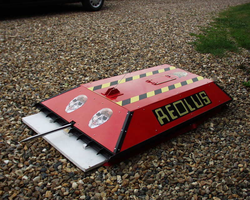 Aeolus was a low, rectangular-shaped tracked robot with front, side and rear wedges and armed with a front low-pressure pneumatic spike. The spike was capable of penetrating through 1mm thick steel, while the robot was powered by Bosch 750W motors driven by custom-made speed controllers designed by Peter Waller. Aeolus was armoured in 3mm aluminium plating, and painted red with hazard stripes and a pair of skulls on its top panel and front wedge.