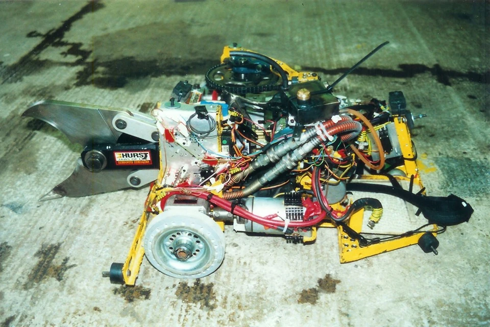 The pincers were capable of cutting through scaffolding pipes and metal box sections. The team tested it on up to 25mm of Alloy. The bottom half of the pincer was extended to make it longer than the top half, so that it could act as a lifter as well. The cutter was controlled by a Strimmer engine which powered a pump for the cutter via a 4:1 chain drive, but it failed to work in the arena.