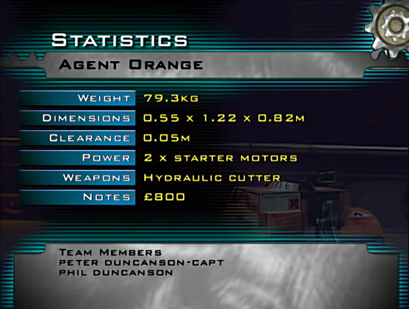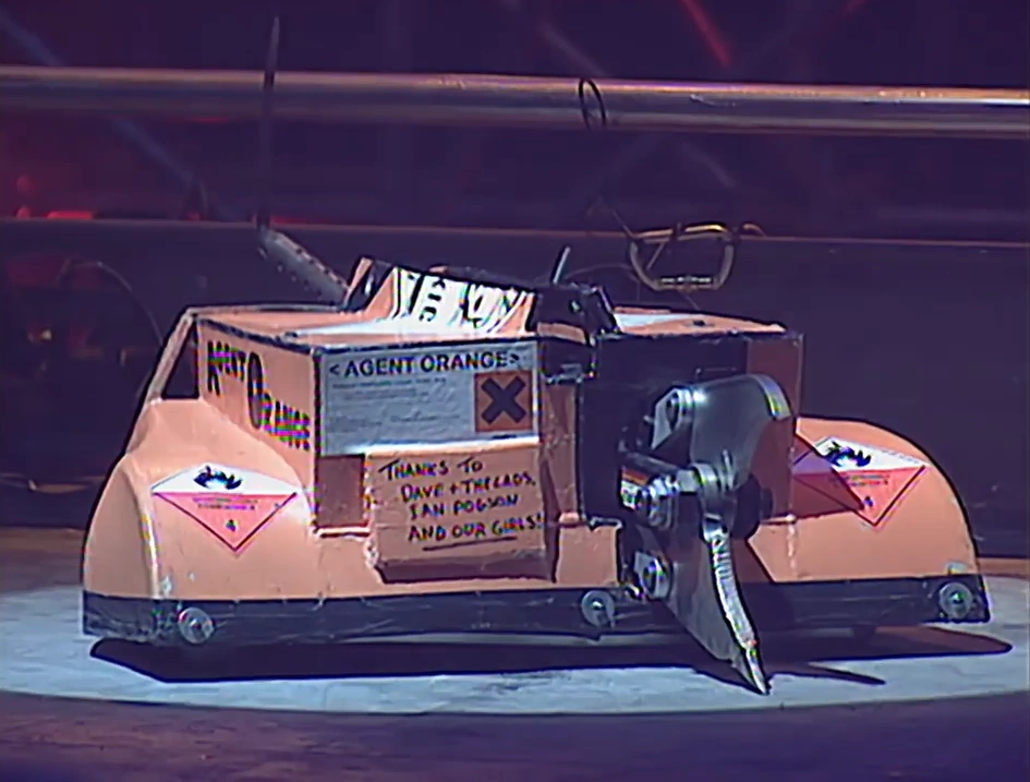 As its name suggested, Agent Orange was an orange box-shaped robot armoured in polypropylene plastic and equipped with two potent weapons - a front set of hydraulic pincers (which closely resembled those used by Sergeant Bash and Sir Killalot in Series 3) and a rear-facing pickaxe made out of a garden fork. The robot cost £800 to build.