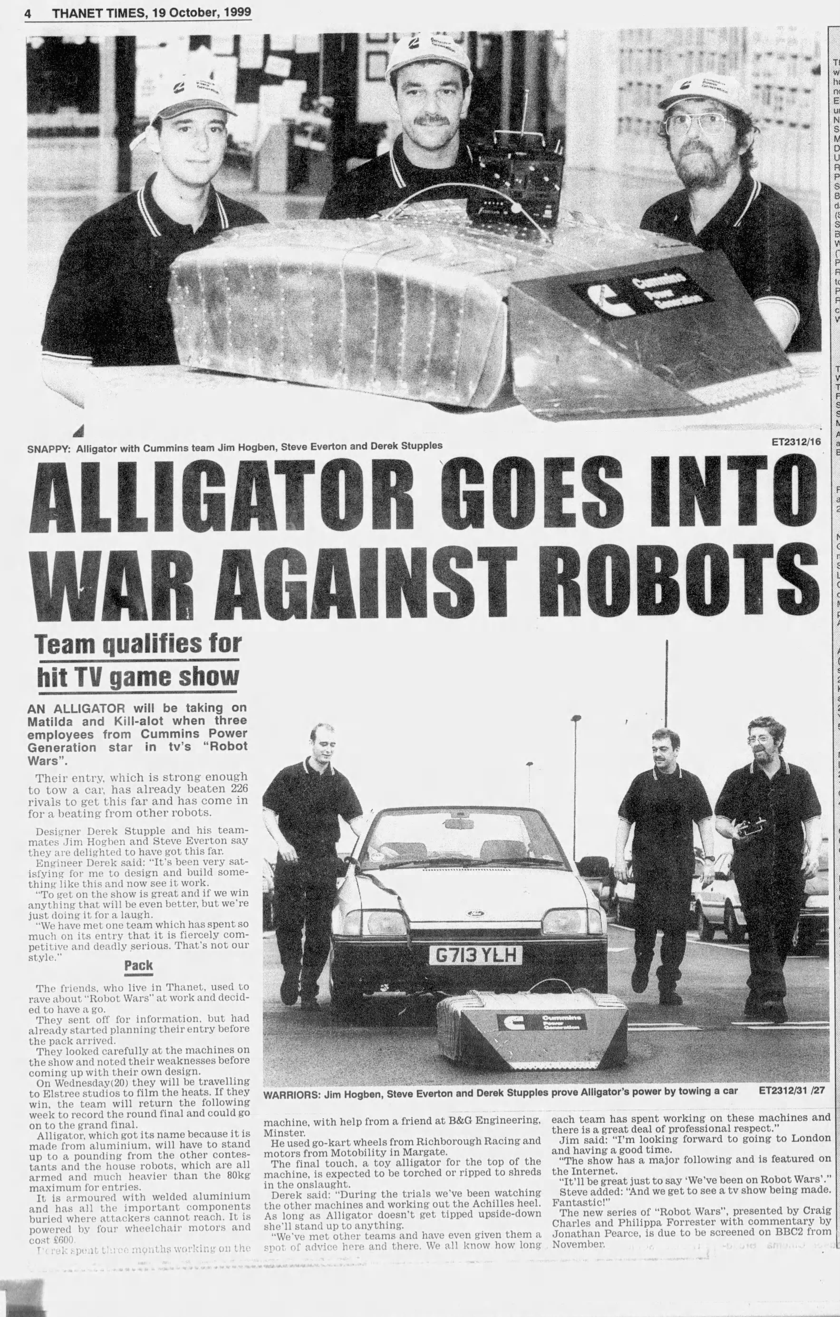 - "The friends, who live in Thanet, used to rave about "Robot Wars" at work and decided to have a go. They sent off for information, but had already started planning their entry before the pack arrived. They looked carefully at the machines on the show and noted their weaknesses before coming up with their own design."