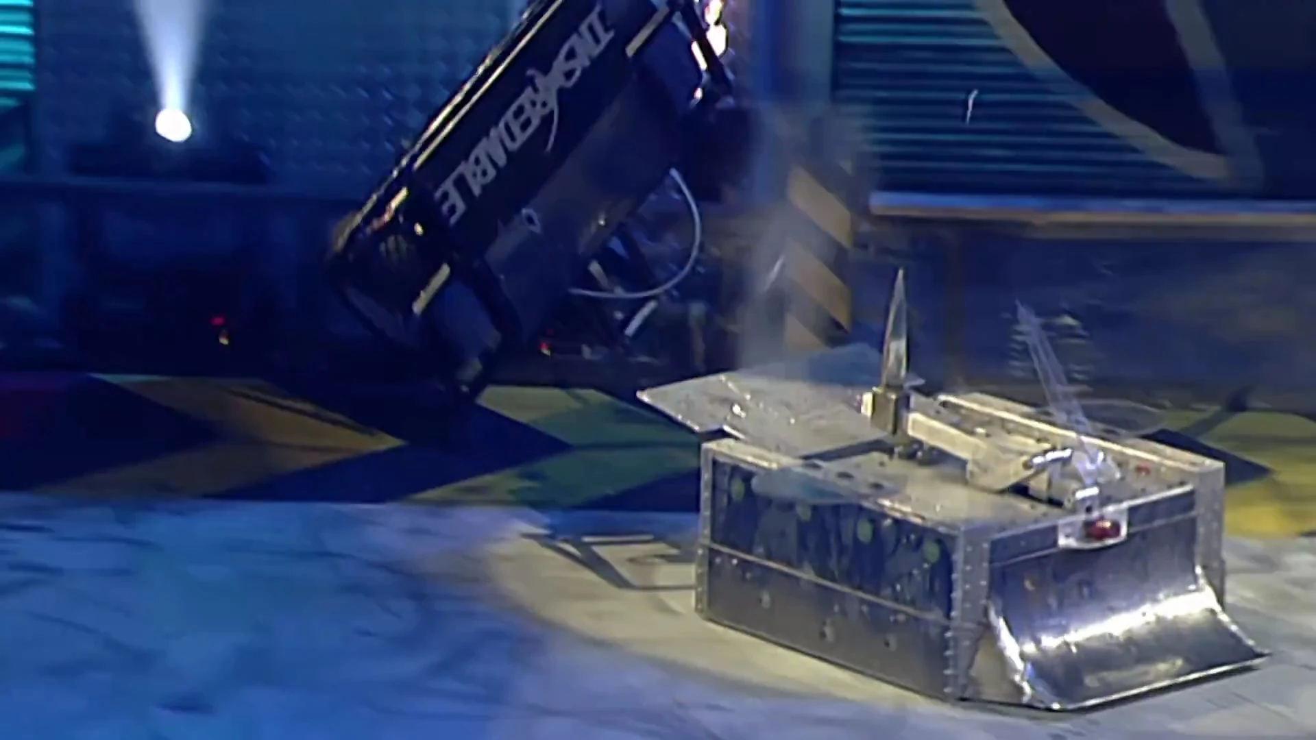 Anarchy rapidly followed this attack with a second flip, while Tornado tried to line its spike up along the side of its flipper. Tornado turned around, then drove past and up the flipper itself. Anarchy tossed Tornado upside-down before it could reverse off, and repositioned itself in the upper perimeter to prepare for a fourth attack. On this occasion, Tornado stopped short before Anarchy fired the flipper. With the flipper still raised - and the polycarbonate panel within now vulnerable - Anarchy was speared, pushed and pinned against the middle entry gate by Tornado, being held there for a few seconds.