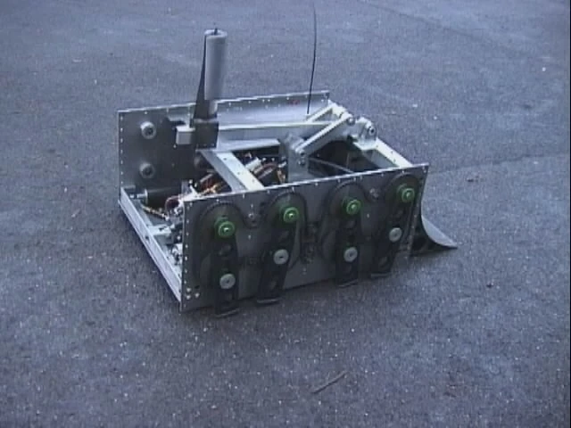 Anarchy was a grey box-shaped robot with eight legs, driven by a series of sprockets, gears and chains of varying sizes. The robot was essentially a heavyweight version of Team 101's Techno Games entrant Scuttle, but with a revised walking mechanism more suitable for combat. Each leg was driven by two cranks, the top one moving the leg up and down without pushing it from side to side, and the other one vice versa. Two pairs of legs would move at a time, increasing stability at its top speed of 5mph, while both sides enabled independent control for turning.[2] This system enabled Anarchy to demonstrate excellent balance while manoeuvring across the Robot Wars Arena - as noted by Jonathan Pearce during its first-round battle - as well as a zero-degree turning circle. The robot was powered by two Bosch 750 Watt motors, giving a relatively high top speed of 5mph, the highest achieved by a traditional walking robot in Robot Wars.[3]