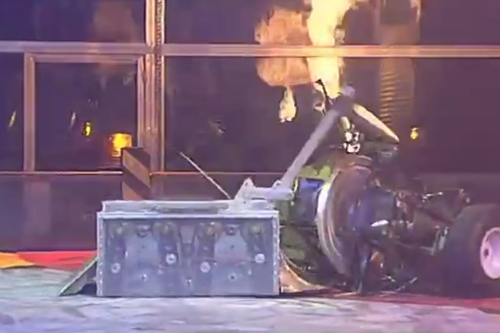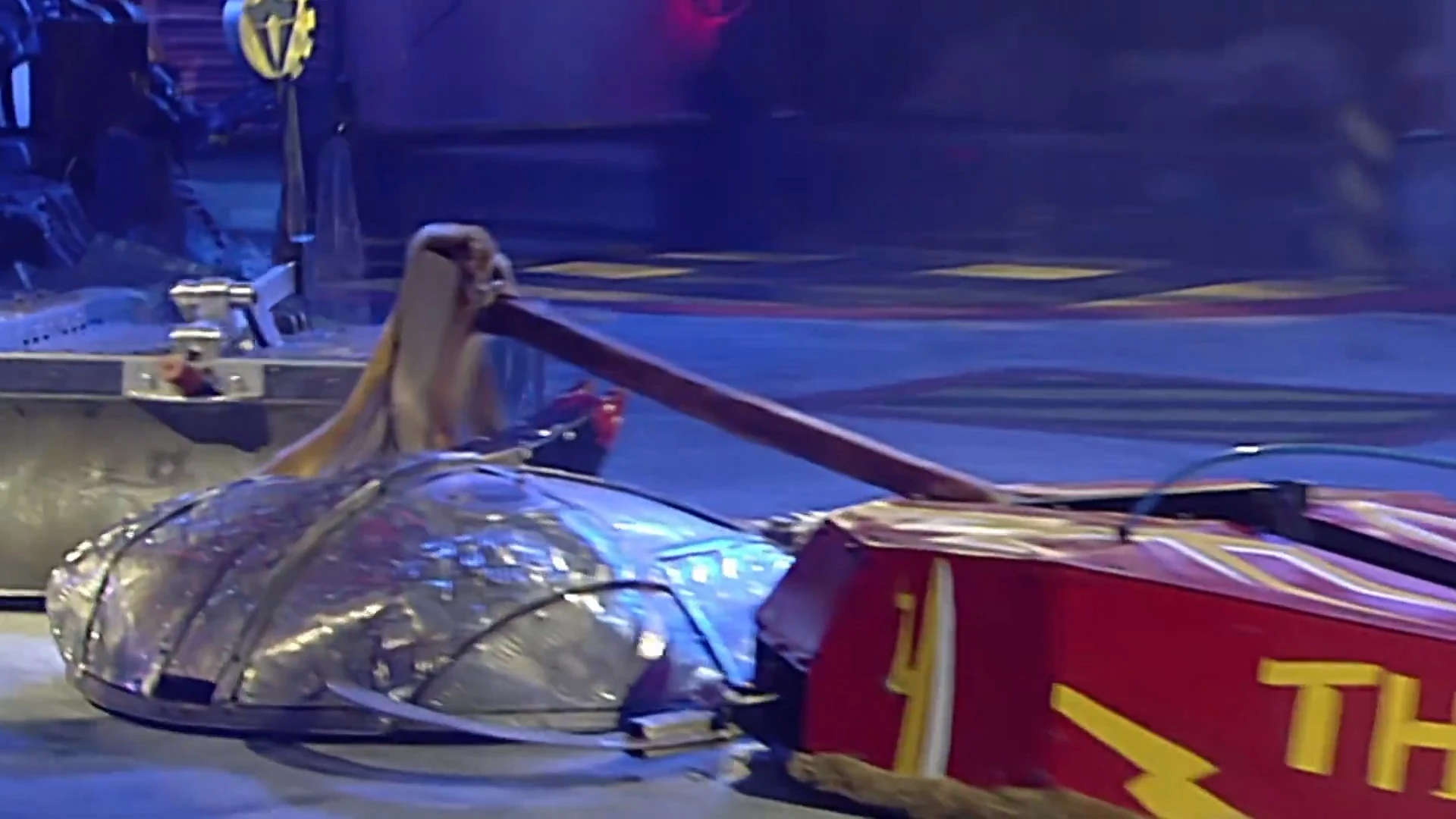 A few seconds later, Judge Shred 2½ reversed out from between the two, proceeding to flip Revolution 2. Anarchy also reversed and axed Judge Shred 2½ a second time, only to be pushed back as Thor closed in once again. It turned and drove across the arena, holding back as Thor and Revolution 2 each attacked Judge Shred 2½ further. Anarchy drove around to the back of Revolution 2, which stood on the flame jet after spearing itself on Judge Shred 2½'s armour again. It too moved over the jet again, and found itself enveloped in flames as it remained in place for a few seconds. Anarchy reversed away, but left behind a fiery trail as flames kept flickering from inside it. These flames quickly died down, as it turned around, reversed and flicked Judge Shred 2½, which was still lodged in Revolution 2's left-most blade.