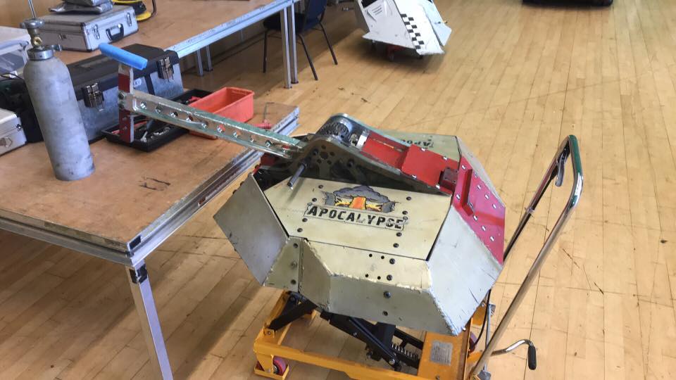 At the second leg in Crawley (7-8 September), Apocalypse reverted to its standard armour configuration for its competition fight against ThunderChild. To bring the robot's overall weight down, Ed Wallace also cut out small sections of its rear armour, shedding a 'few grams'. A close, but largely tentative pushing match saw Apocalypse land axe blows on ThunderChild's armour and flipping arm, while also peeling the latter's top-left panel upwards through head-to-head collisions. Ed Wallace's machine was declared victorious on a 22-18 judges' decision. Apocalypse followed this up with another tentative and closely-fought three-minute battle, against Mako at Stoke-on-Trent (26-27 October). Surviving multiple flips from Laurie Calvert and Carol Ovenden's machine, while inflicting axe blows and delivering it into the Thunder Drum hazard in return, it was declared the winner on a split decision.