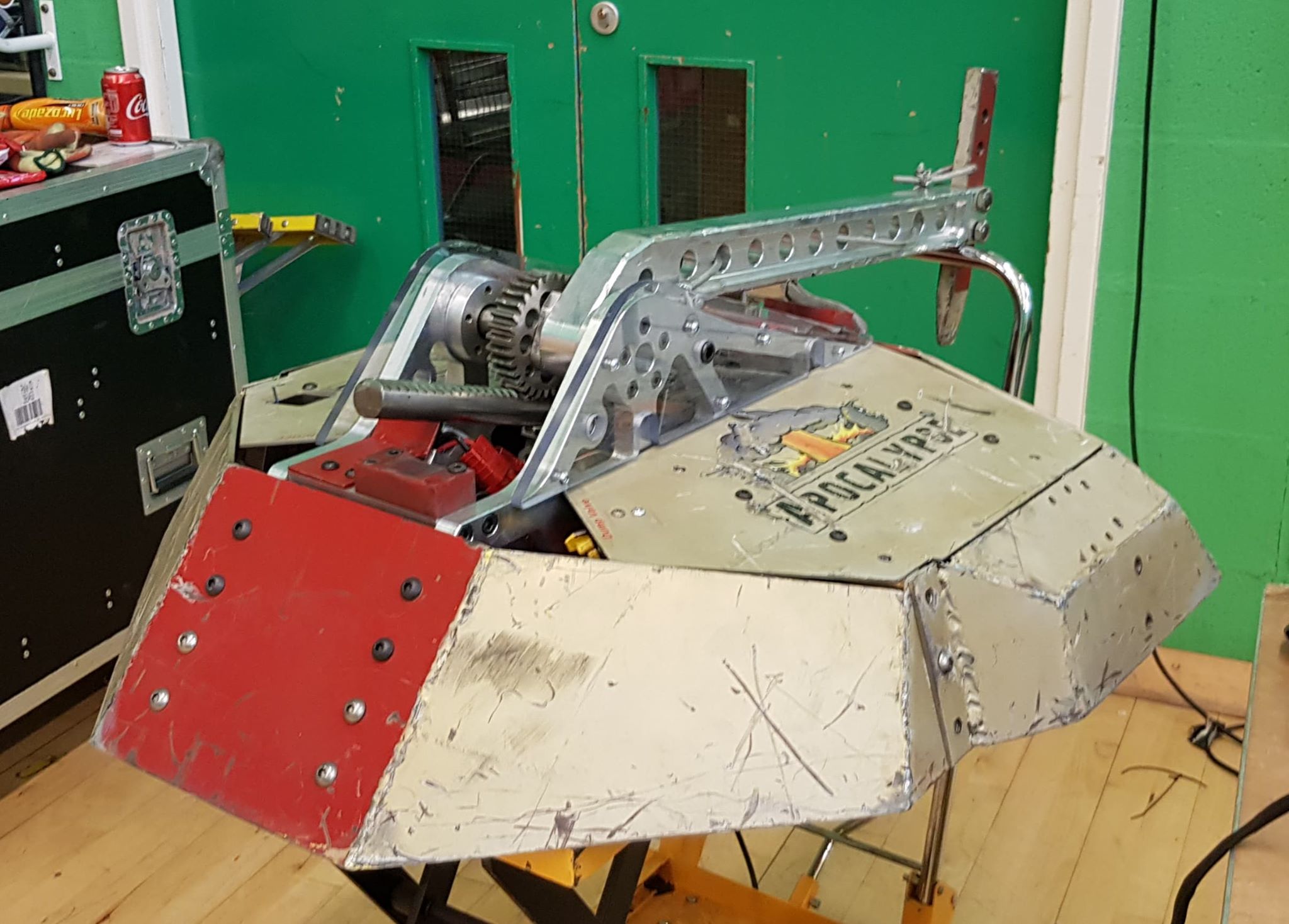 The televised Robot Wars incarnation of Apocalypse was initially armed with the axe only and fought exclusively at Robots Live! events. It made its competition debut at their Stevenage event in October 2016, participating in the FRA UK Heavyweight Championship as well as various whiteboard battles. In one particular battle, Apocalypse's top panel was damaged by Gabriel, so Ed Wallace donated this piece to Alex Brown's charity auction in 2017.