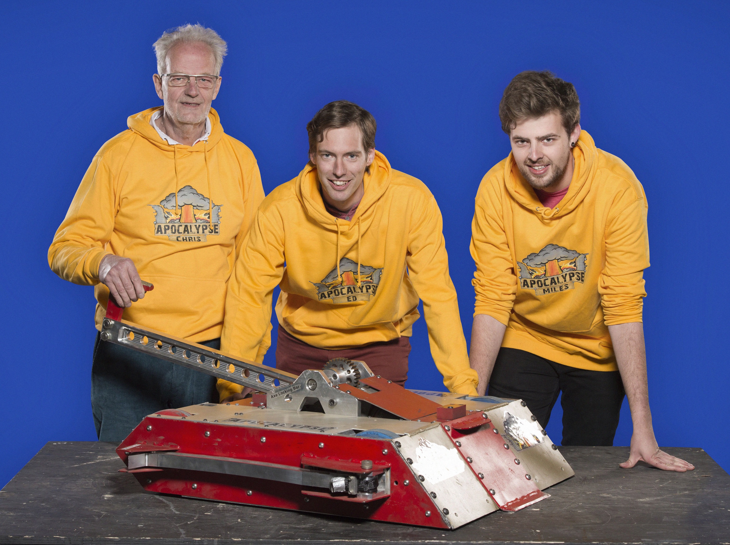 Apocalypse was entered by Team Asgard, captained by 33-year old Ed Wallace, who was previously a member of the production crew for the previous two series of Robot Wars and also entered the pilot episode with Turbulence. Ed Wallace was the sole builder of Apocalypse, and was in charge of its maintenance, also driving the robot in both of its battles. For Series 10, Ed Wallace was joined by his employer, 75-year old Chris Page, the oldest roboteer to appear in the reboot of the show. This created a narrative throughout Apocalypse's campaign, as Ed Wallace's position as team captain allowed him to give instructions to his own employer while Chris Page assisted with the repairs of Apocalypse. 23-year old apprentice engineer Miles Page also joined the team as the weapons operator, controlling Apocalypse's axe and grabbing arms.