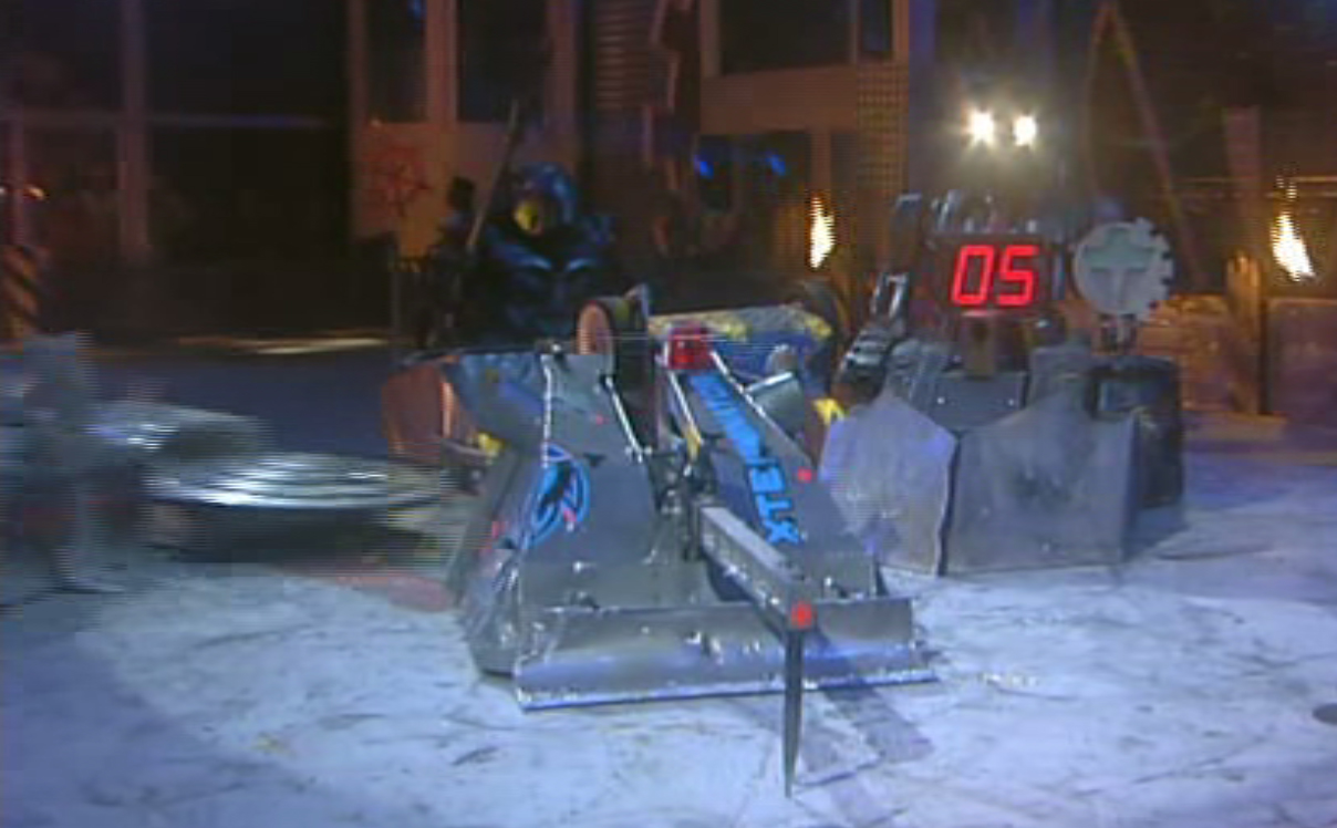 This allowed Wild Thing to topple Arnold A. Terminegger over with a push, but Arnold A. Terminegger rolled back onto its wheels and survived a few shoves from Wild Thing as it axed the latter a few times. It almost drove itself into the descending pit after Wild Thing activated it, but axed Wild Thing again a few more times and lifted it onto its left-hand wheel. Arnold A. Terminegger used both its axe and forks to stop Wild Thing from falling back onto its wheels, leaving the veteran spinning on its left-hand wheel.