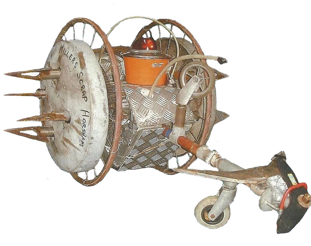 | Frank | 1995-1996 US Championships | Swinging sledgehammer;[3] wheels included four bicycle tyres as treads. Able to self-right if flipped onto the side of either wheel.[4][5] 1995 Heavyweight Melee Finalist as Spirit of Frank. | |