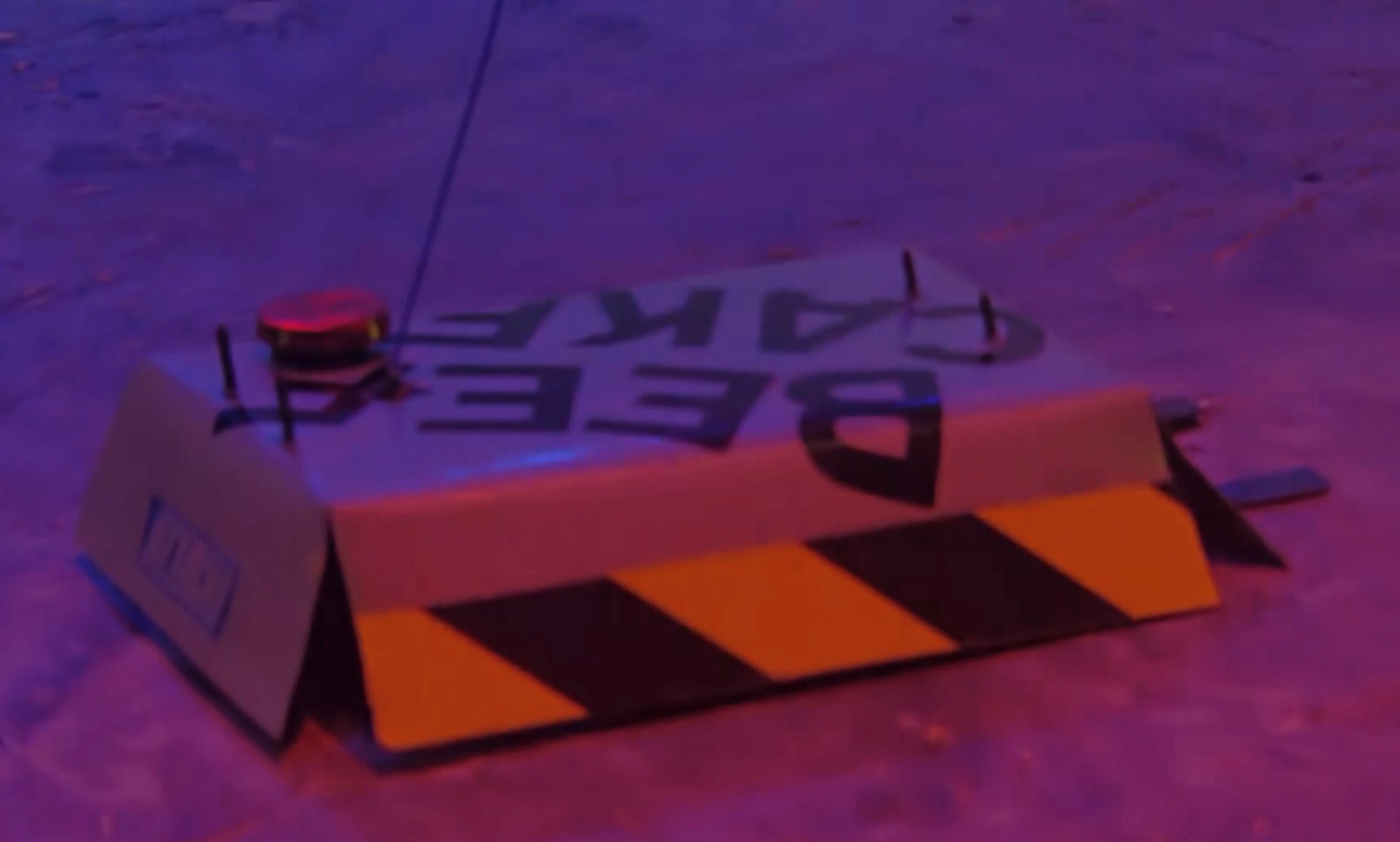 Beef-Cake was a steel box-shaped robot built around the chassis of a radio-controlled car, armed with two static ramming forks at the front. The robot was painted silver with its forks and name in black, while it also featured side skirts painted in hazard stripes, a flashing red light on the rear, and a blue aerial.