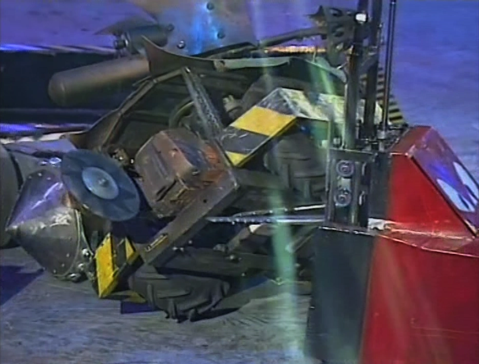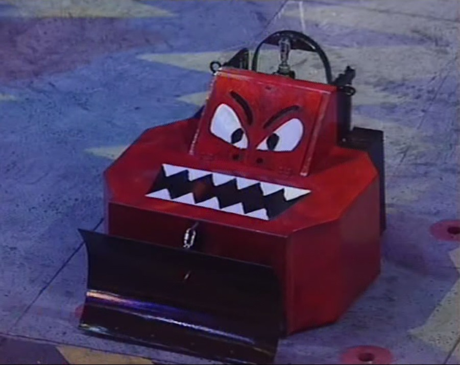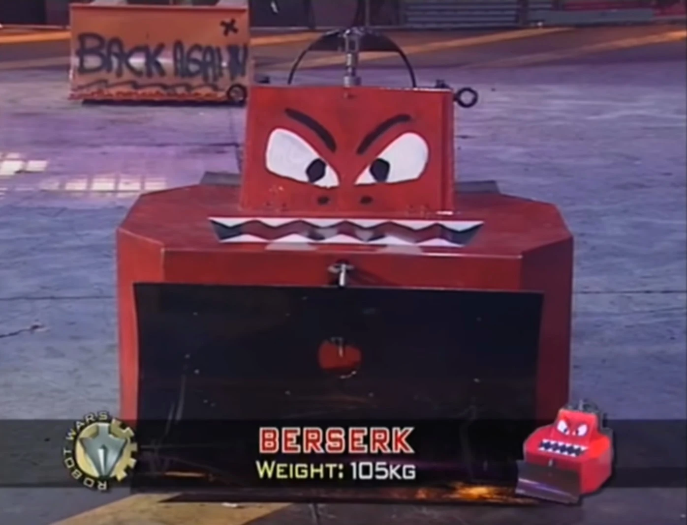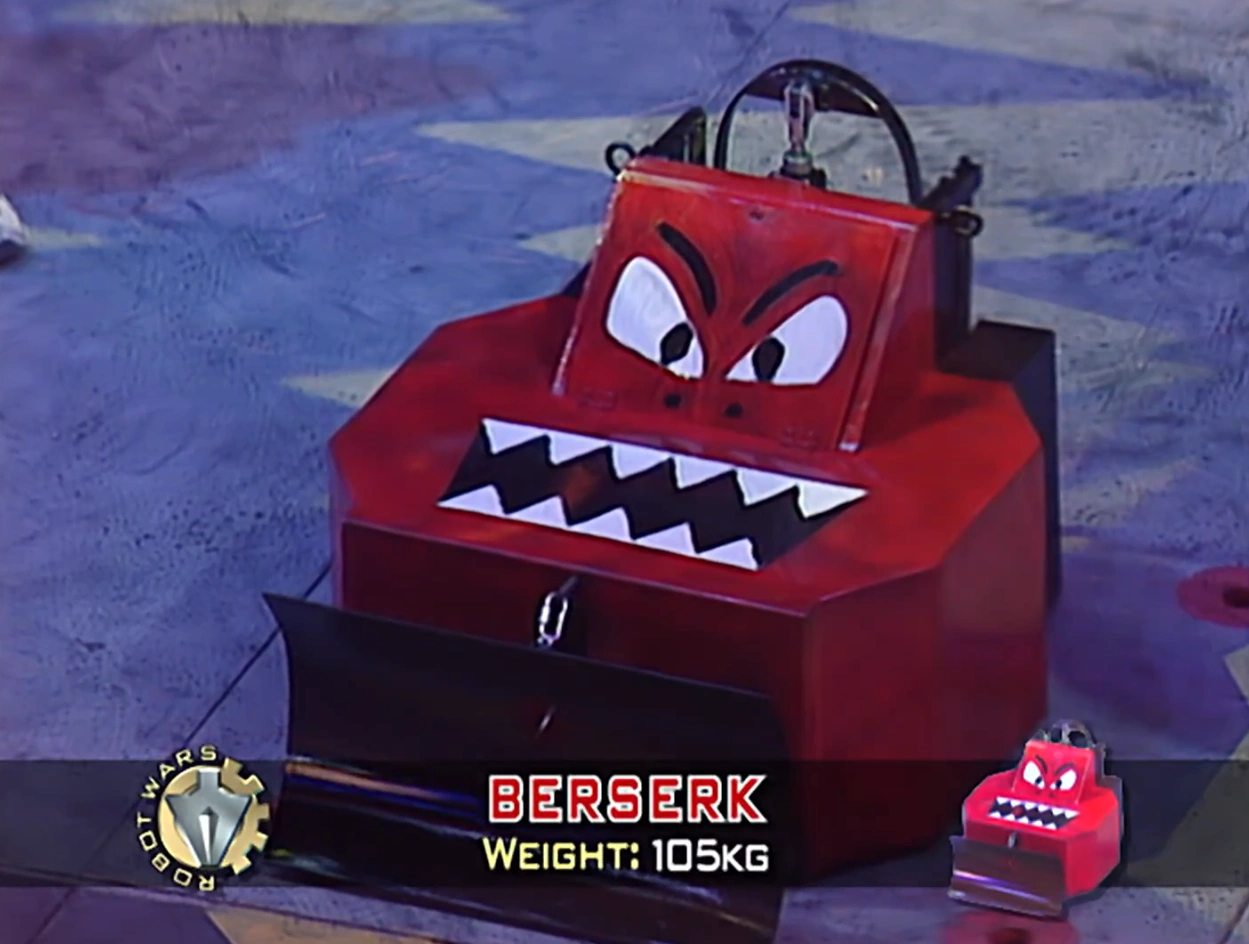 Berserk was a large red box-shaped robot armed with a static front scoop and a rear forklift designed to lift and topple other robots over. It featured an angry face on its top panels, and the forklift proved capable of lifting its fellow opponents and the House Robots throughout its appearances, although the robot had no ability to self-right and broke down in its second battle. At 105kg, Berserk surpassed the heavyweight limit of its time by 25kg.