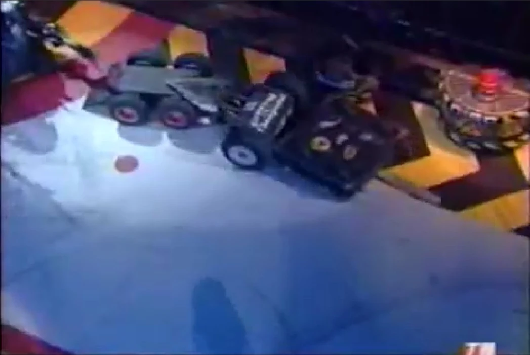 Black Widow turned around as Texas Tornado pushed Unibite 2.0 off the wall, pushing it by the flame jet, but in doing so, it drove onto the flame jet. As it reversed, it suddenly broke down, and Black Widow pushed past Unibite 2.0 as it drove down the arena. Black Widow turned around, and drove past Unibite 2.0, but as Unibite 2.0 drove after it, Black Widow accidentally turned and drove into Sir Killalot's claw. Sir Killalot pushed it aside with the claw, but then he grabbed Black Widow by one of its cutters.