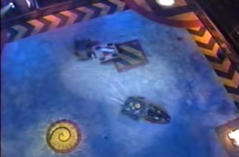 Black Widow went out first against Joker, and the two robots drove straight at each other. Joker tried to damage Black Widow with its disc, but Black Widow got under the disc with the wedge and pushed it down the arena, until Joker managed to turn and reverse. Joker drove back at Black Widow with its blade spinning and hit Black Widow, but it did no damage, and Black Widow drove away up the arena. Black Widow drove to the Disc of Doom trigger, but after it hit the trigger, Joker drove into its side, hitting the wheels with the disc, but Black Widow was unaffected, and reversed.