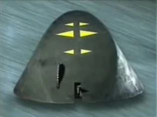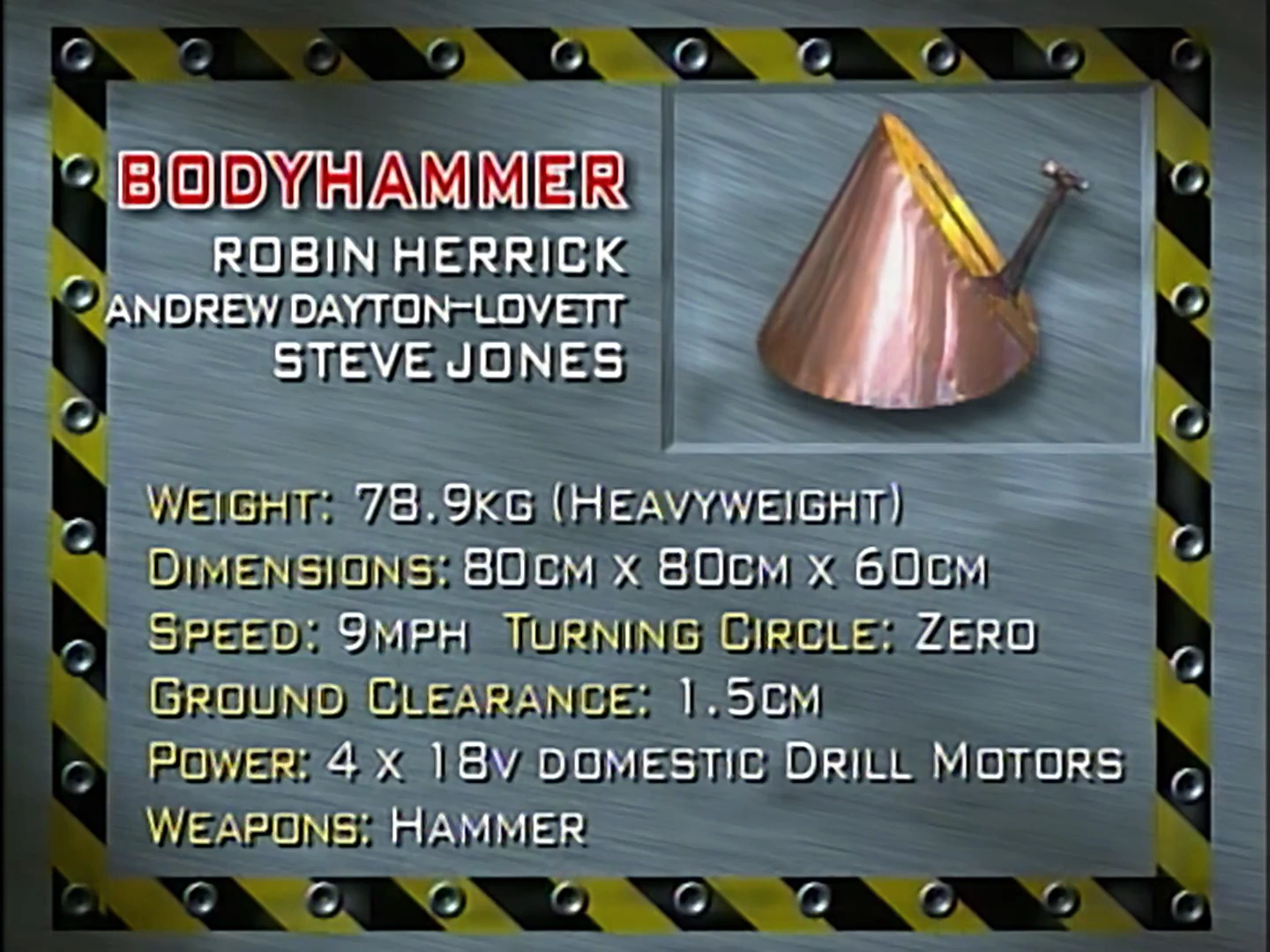 Bodyhammer was a tall, conical robot with two-wheel drive and a flat-sided front, whose weaponry and armour varied considerably between series. In Series 1, it was armed with a small front-mounted hammer and featured a chassis and bodyshell made out of tough polypropylene-glass composite material. This material was supplied by team member Andrew Dayton-Lovett, an expert in thermoplastic composites, with the shell covered in stainless steel sheeting. Bodyhammer's steel layer was heat-treated, with the oxidisation process giving it a distinctive copper and gold colour.[1] The robot's colour and shape resulted in Jonathan Pearce likening it to a 'coal scuttle' throughout its appearances in this series.