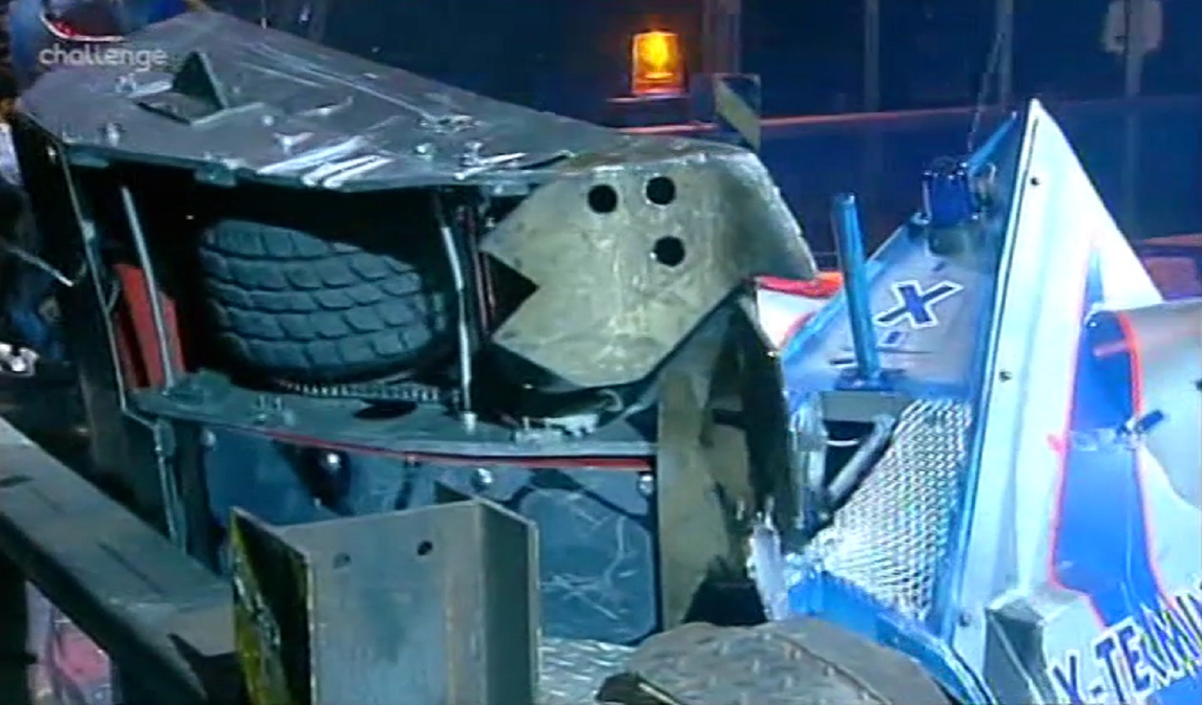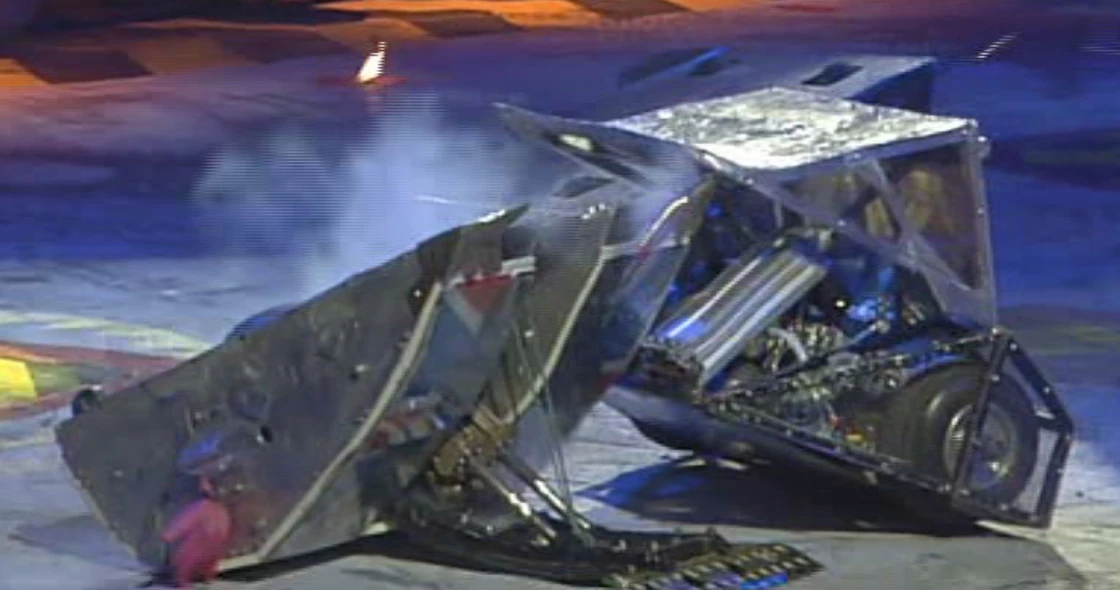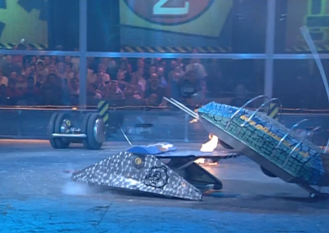 Bulldog Breed attempted to use its saw blades on Robopig's wheels, but Robopig got away before any damage was sustained. Robopig gently pushed Bulldog Breed towards the flamethrowers on the arena wall and then towards the CPZ where Shunt was waiting. By now, Bulldog Breed appeared to have lost all mobility as Shunt axed through its top and lifted it up slightly. After two more axe blows from Shunt, Bulldog Breed regained mobility, but only for a few seconds, as it stopped once again. Robopig bumped Bulldog Breed back into the flamethrowers and the latter reversed back into Shunt's CPZ. Shunt lifted Bulldog Breed up with its scoop and axed its back end before pushing it out of the CPZ onto the arena spike.