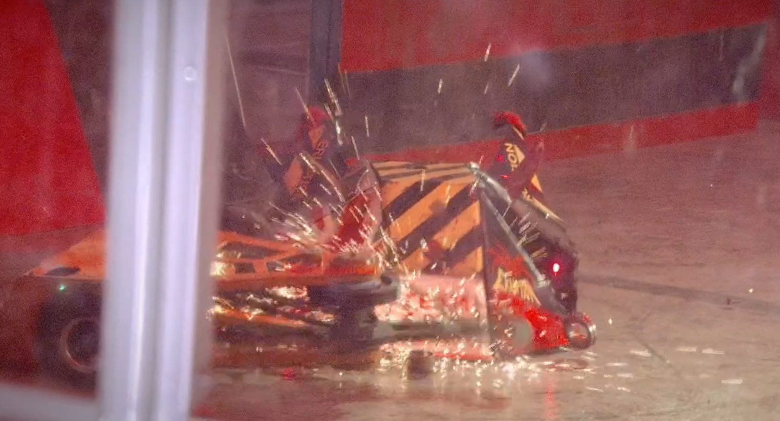 With its bar spinner still not functioning, Cathadh bumped and lured Eruption across the arena, before pushing the latter back and forcing it to flip itself over. It retreated into the corner just as ‘Fog of War’ was enabled, before driving into Eruption just as the fog cleared. After some time trying to lure Eruption around again, Cathadh was flipped twice by Michael Oates’ machine; the second flip resulted in Cathadh landing upside-down after its rear clipped the wall. Spinning in circles, Cathadh was thrown into the wall twice more by Eruption, only for its bar spinner to suddenly start rotating. With this, it reversed, sparks flying as it hit Eruption’s flipper. Cathadh continued to damage Eruption while being simultaneously pushed into the corner – however, the sustained impacts caused the weapon belt to slip off.
