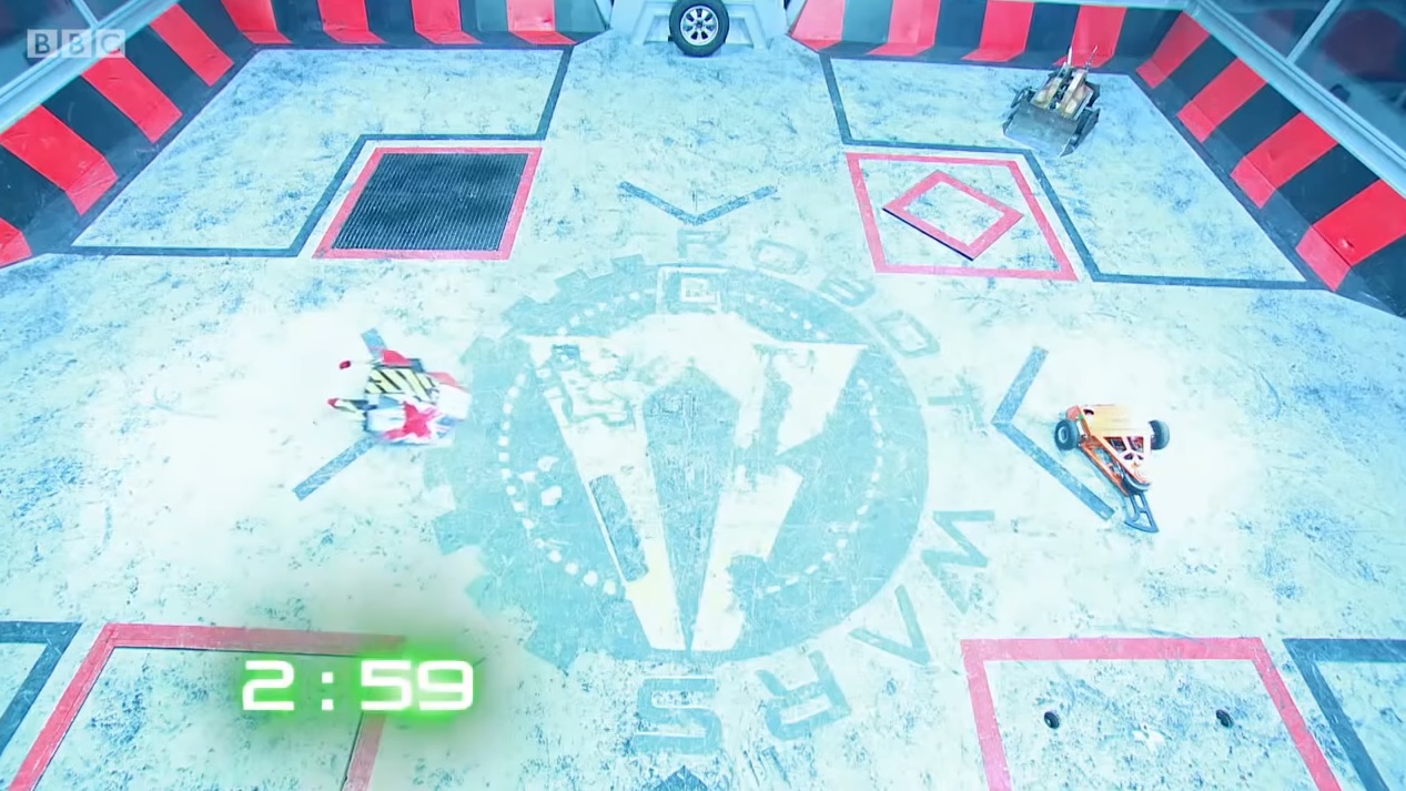 In an attempt to gain an advantage over Eruption, Cathadh was positioned sideways on its starting spot, with the intention of turning and hitting Eruption with the spinner as it came near. However, Team Toad’s plan unravelled in the opening seconds, as the spinner failed to start before Eruption drove towards it due to the damage caused by Concussion in the Tag Team stage[4]. Cathadh darted away over the spark jets, but was constantly bumped, pushed and chased around the arena by Eruption, eventually hitting the Arena Tyre. In doing so, it triggered ‘Rogue House Robot’ – Shunt momentarily drove after and into Cathadh, but Cathadh escaped by reversing and bumping into the Tyre. Despite sustaining another few bumps and shoves from Eruption and Shunt, it continued driving through an empty CPZ, even proceeding to drive into the side of Shunt as the House Robot chased after Eruption.