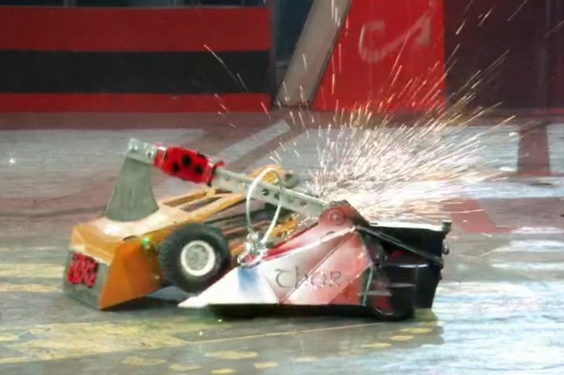 Following an inter-team discussion, Terror Turtle fought first, with Cathadh staying out of the action until the former was flipped and immobilised by Concussion. Having spun its weapon up in the meantime, Cathadh slowly drove out of its corner and into an approaching Thor; the impact deflected it away from Thor, leaving Cathadh vulnerable to an axe blow from the Series 8 Grand Finalist. Cathadh’s spinner caught one of the steel cables attached to Thor’s front, ripping the cables and causing its weapon belt to slip. The robot sustained another side-on slam from Thor which stunned it – seconds later, Concussion left its corner to throw Cathadh over and into Shunt. By this point, Cathadh’s mobility was severely limited – Shunt pushed it into the centre of the arena, where it was left struggling to drive around upside-down.