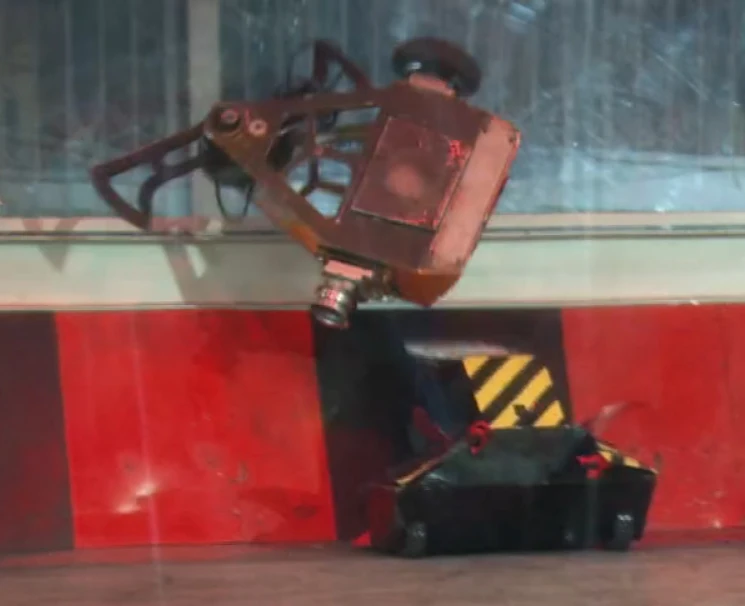Weaponless once again, Cathadh was thrown violently against the wall by Eruption, reversing and spinning away to escape. However, its right tyre sheared off its axle as it was thrown upside-down again, leaving it immobile on one side as Eruption continued to flip it alongside the wall. As in its previous battle, Cathadh was counted out, before Matilda pushed and threw it in the pit.