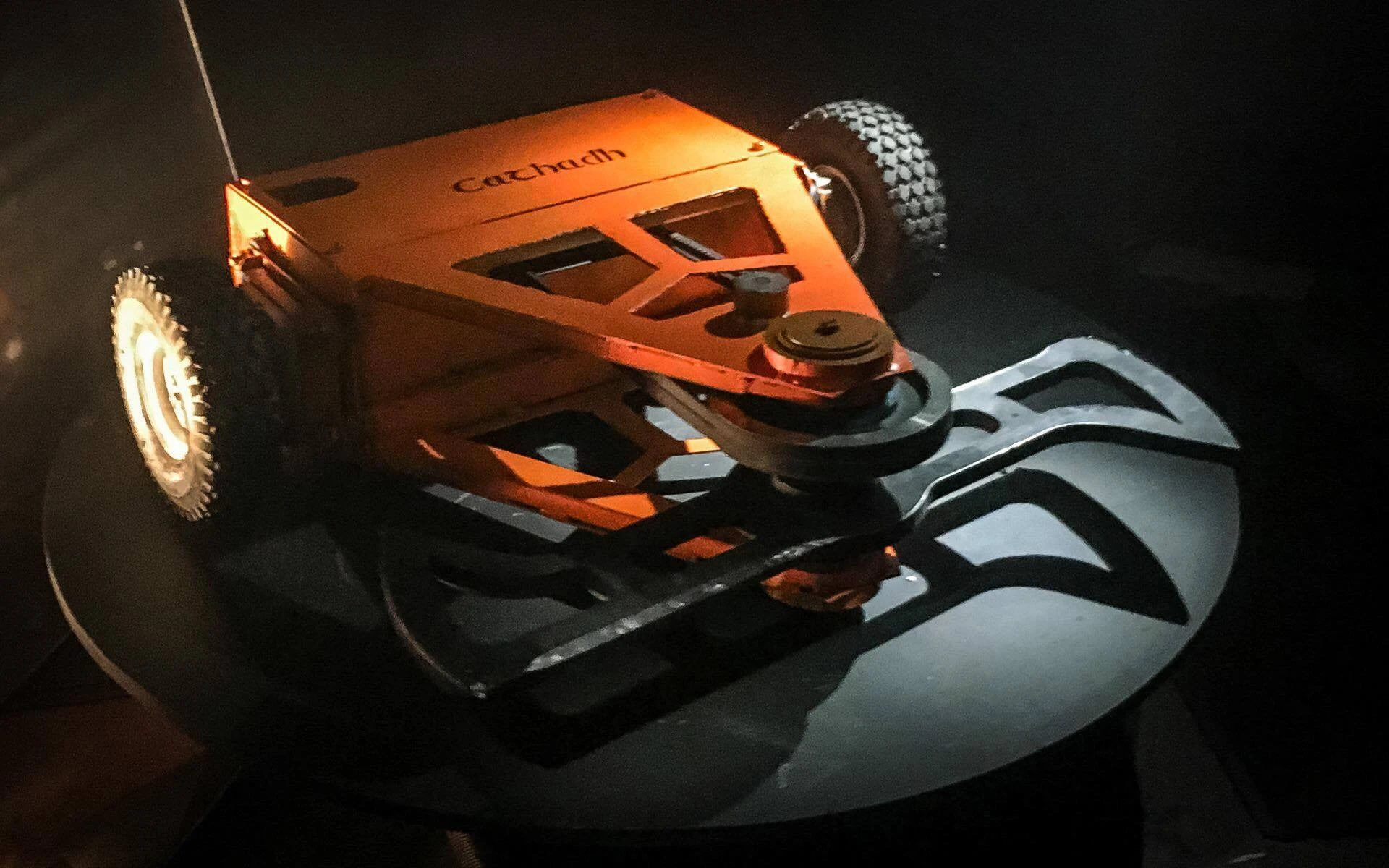 The robot had previously competed as Arena Cleaner in Robot Wars: Battle of the Stars, and thus reuses many of the stock components used by the other loanerbots built by Robo Challenge. It differs from Arena Cleaner in using new wheels, tyres and electronics - including a new transmitter - all supplied and installed by Michael Mauldin.[2] To accommodate the new additions, various weight savings were made to Arena Cleaner's chassis and armour, primarily through smoothing off the sides and cutting holes through the top and bottom of its weapon mount. Cathadh was also repainted into the signature orange-and-black colour scheme used by other robots built by Team Toad, an alteration requested by Mauldin and approved by Robo Challenge.