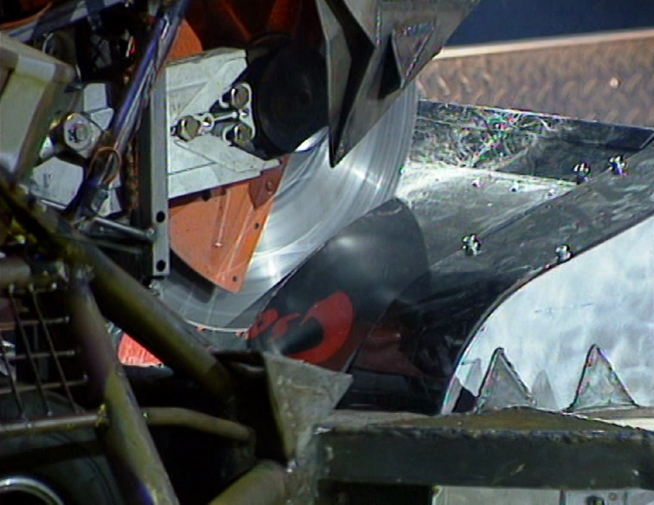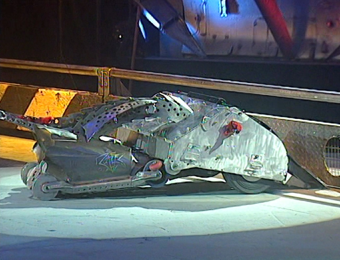 The only modification made to Chaos 2 for Series 4 was a new set of covers[8]. After winning Series 3 and 4, Chaos 2 was rebuilt[9] for Series 5 and Extreme 1 with improvements to its flipper and armour. Titanium was used for extra plating beneath the front polycarbonate wheel covers, along with a new 7mm-thick flipper plate to replace the worn Dural equivalent. The flipper itself also received new larger diameter rams, new valves and a larger CO2 canister. The batteries were also replaced with smaller ones in order to accommodate the bigger rams, though this caused problems with weight distribution that prevented increasing Chaos 2's weight to the new 100kg limit; consequently, it only weighed 83-4kg from Extreme 1 onwards.[10] From Series 5 and in some of its Extreme 1 matches, an extra piece of titanium was also added to the rear polycarbonate panel above the gas canister to prevent it from getting punctured by axes and crushers.