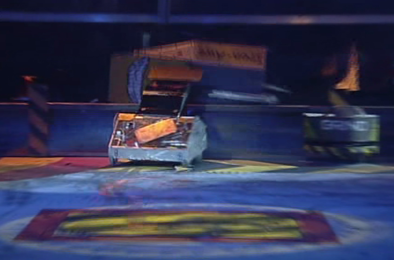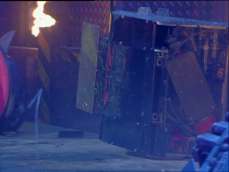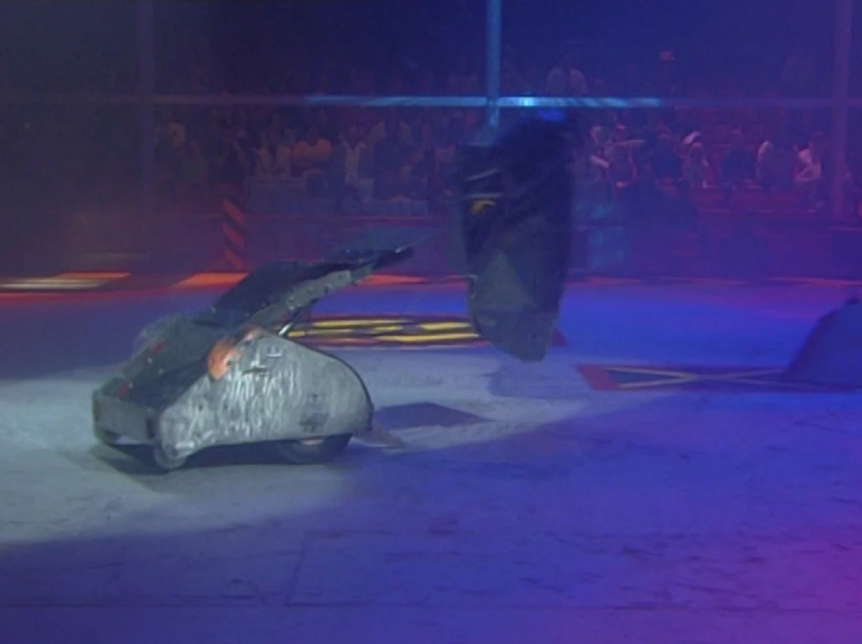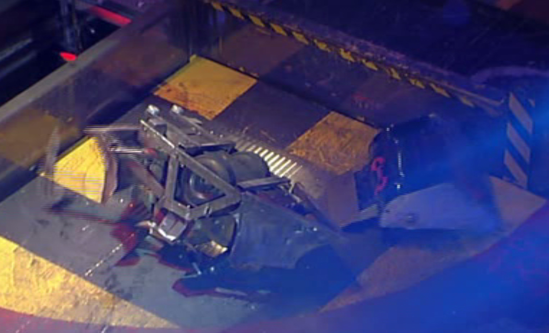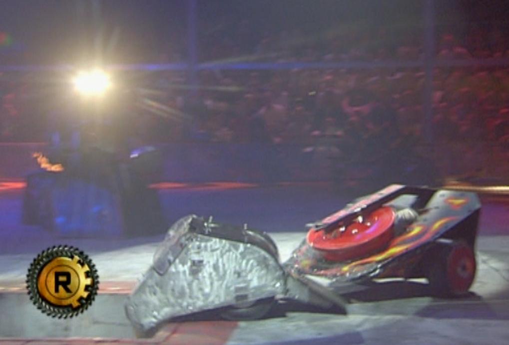 Chaos was left helpless as Mace damaged its armour with its flail. With Chaos immobile, the House Robots came in. Shunt accidentally re-righted Chaos while hammering it with his axe, allowing Chaos to dart away across the arena. It soon found itself trapped by Dead Metal and Matilda, and Matilda flipped it over onto its back again.