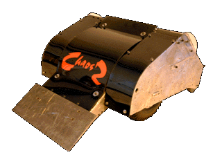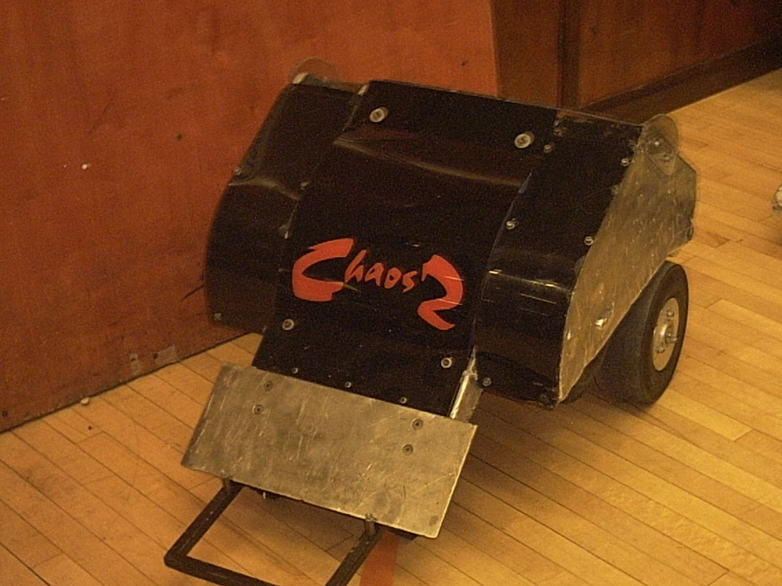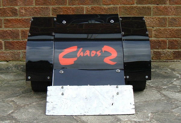 Chaos 2 was a compact, two-wheel drive dual-wedged robot, initially armoured in 10mm Dural plating (an alloy comprising of aluminium, copper and magnesium)[4] with polycarbonate top covers. Powered by a pair of lawnmower motors, it was armed with a powerful high-pressure pneumatic flipper hinged at the rear. The flipper was powered by a liquid CO2 fire extinguisher and twin pneumatic rams expanding at 570/1, and was powerful enough to act as a self-righting mechanism and to toss robots over and out of the arena. Chaos 2 was the joint pioneer of the rear-hinged flipper, along with Facet, and proved a major influence on several robots which subsequently adopted this weapon type. The high pressure flipper became the first of many to be fitted with a restraining bungee cord, assembled on two pulley wheels to prevent the weapon from firing too wide open and breaking off. Chaos 2 also boasted superb traction, a low centre of gravity at the rear - although its ground clearance at the front was much higher - a zero turning circle and a top speed of 20mph, although this was quoted as 12mph in several Robot Wars publications. Chaos 2 was designed to correct the mistakes made with the original Chaos, such as the narrow flipper blade and the inability to self-right.