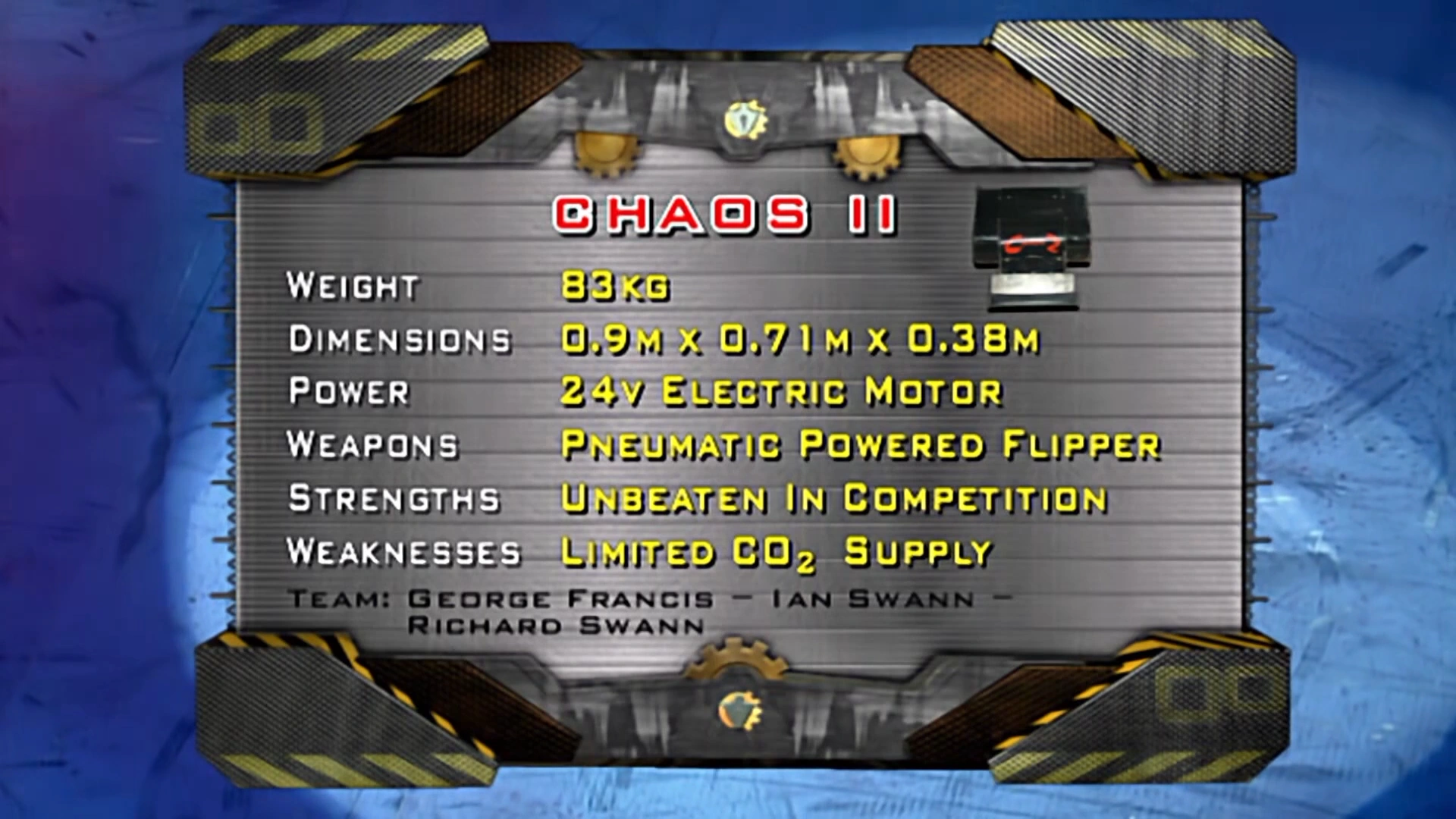 A previous machine, known simply as Chaos, also competed in Series 2 and made the heat final before being retired in favour of Chaos 2.