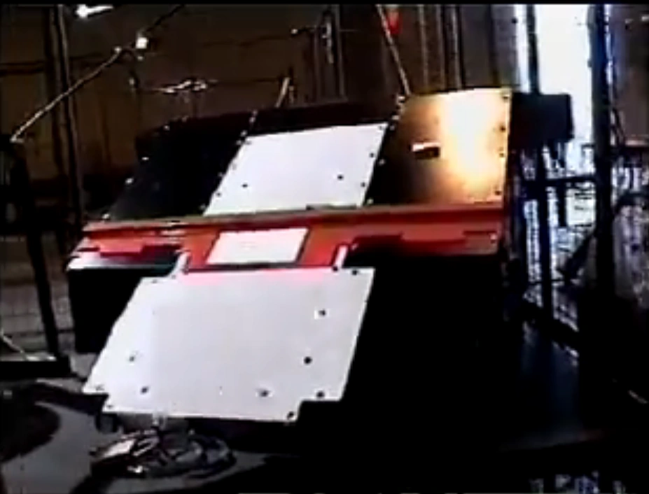 Colossus was a chain-driven basic wedge robot running on 11' go-kart wheels and was painted black for its debut. The robot took over 300 hours to build over 18 months, at a cost of £6,000. Local sponsors provided some of the money, the rest was funded by the team. It featured a pneumatic flipper powered by two 100mil bar rams which was capable of flipping a car tyre 10 feet in the air, titanium dural armour, a 19mm square box section chassis and a diamond edged cutting disc at the back running off a 750W motor[1]. The robot was powered by two electric 750 Watt motors. However, the flipper did not function as a self-righting mechanism, which cost it in its first battle.