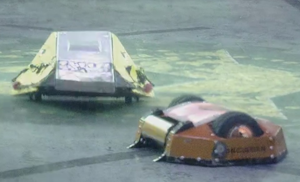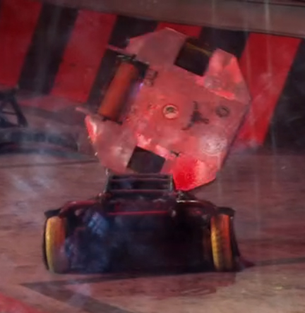 Both robots slammed into each other in the opening seconds. It chased and pushed Thor towards a CPZ as the latter triggered 'Rogue House Robot', but was caught by Dead Metal and pinned against the wall as the latter sliced into its top panel.