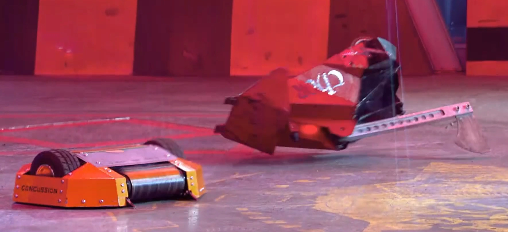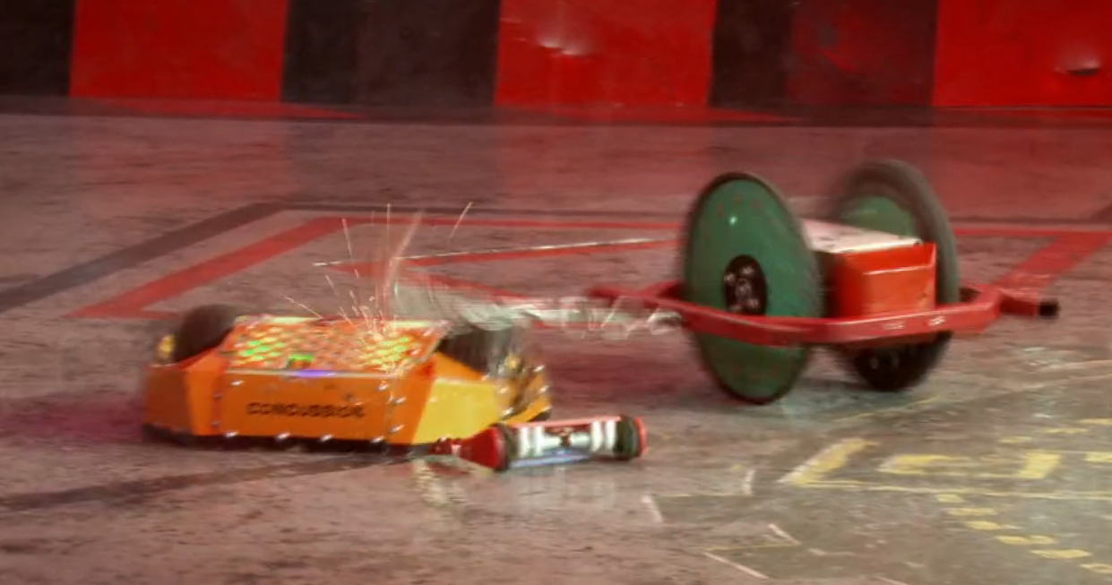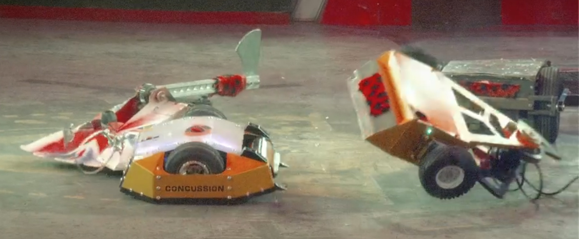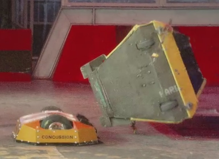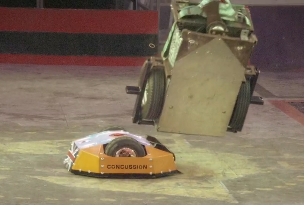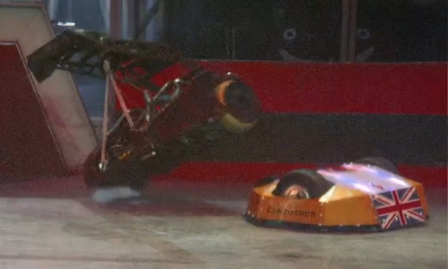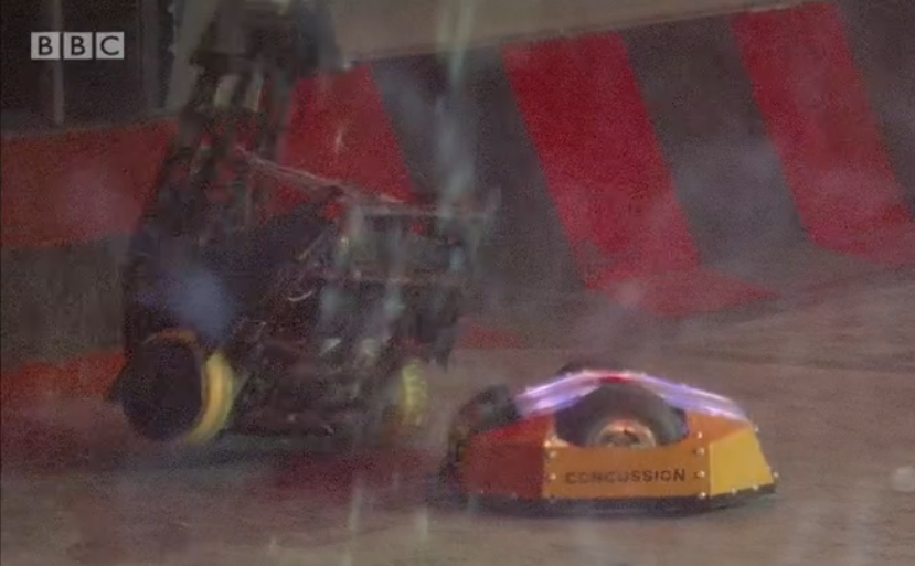 With Concussion stuck underneath Matilda, Thor axed Matilda's tusks before Dead Metal grabbed Concussion again and the three robots separated. Still trying to drive itself off the Pit panel, Concussion drove around in circles, only to clip Thor's left-hand wheel-guard with its drum and flip it over as the latter charged towards it. This was done with Concussion's drum spinning at half power.[19]