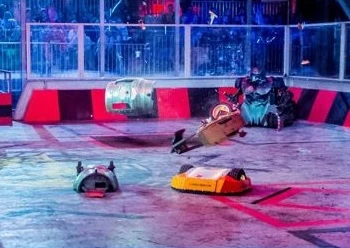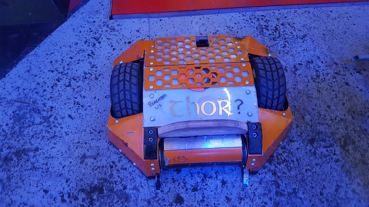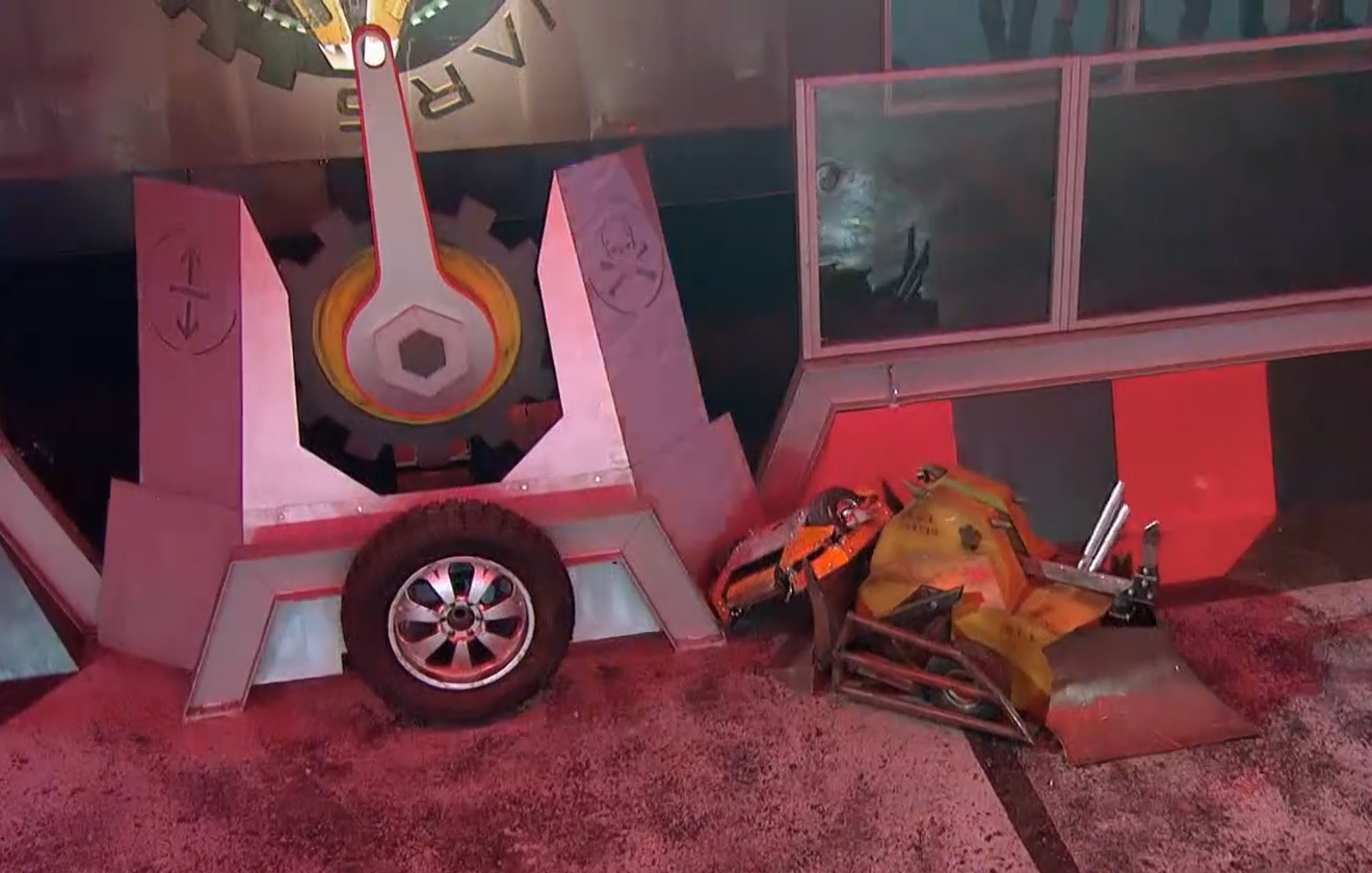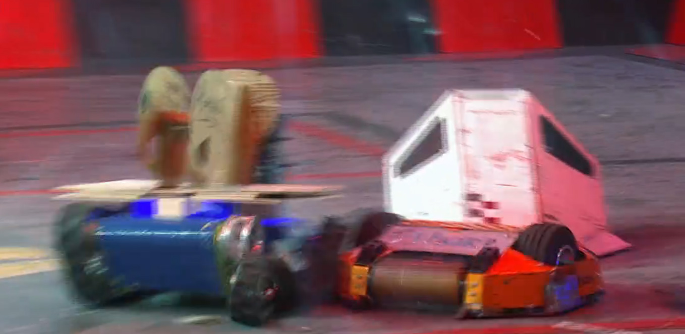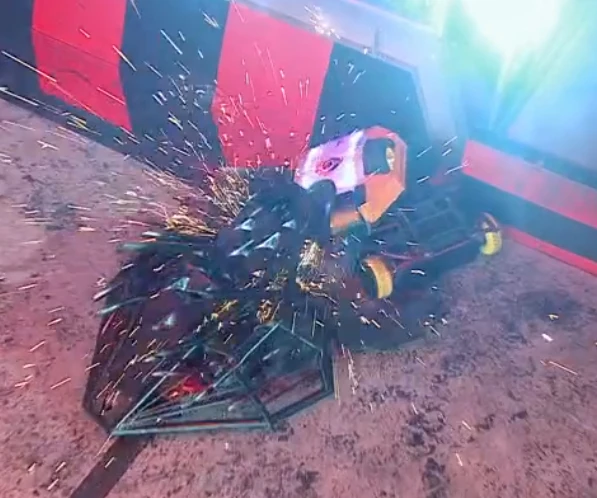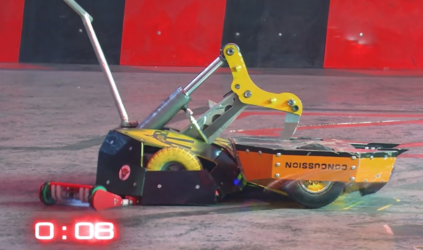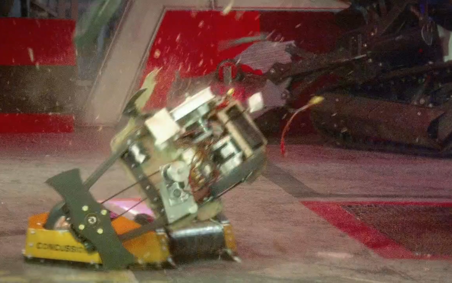 With Concussion stuck underneath Matilda, Thor axed Matilda's tusks before Dead Metal grabbed Concussion again and the three robots separated. Still trying to drive itself off the Pit panel, Concussion drove around in circles, only to clip Thor's left-hand wheel-guard with its drum and flip it over as the latter charged towards it. This was done with Concussion's drum spinning at half power.[19]