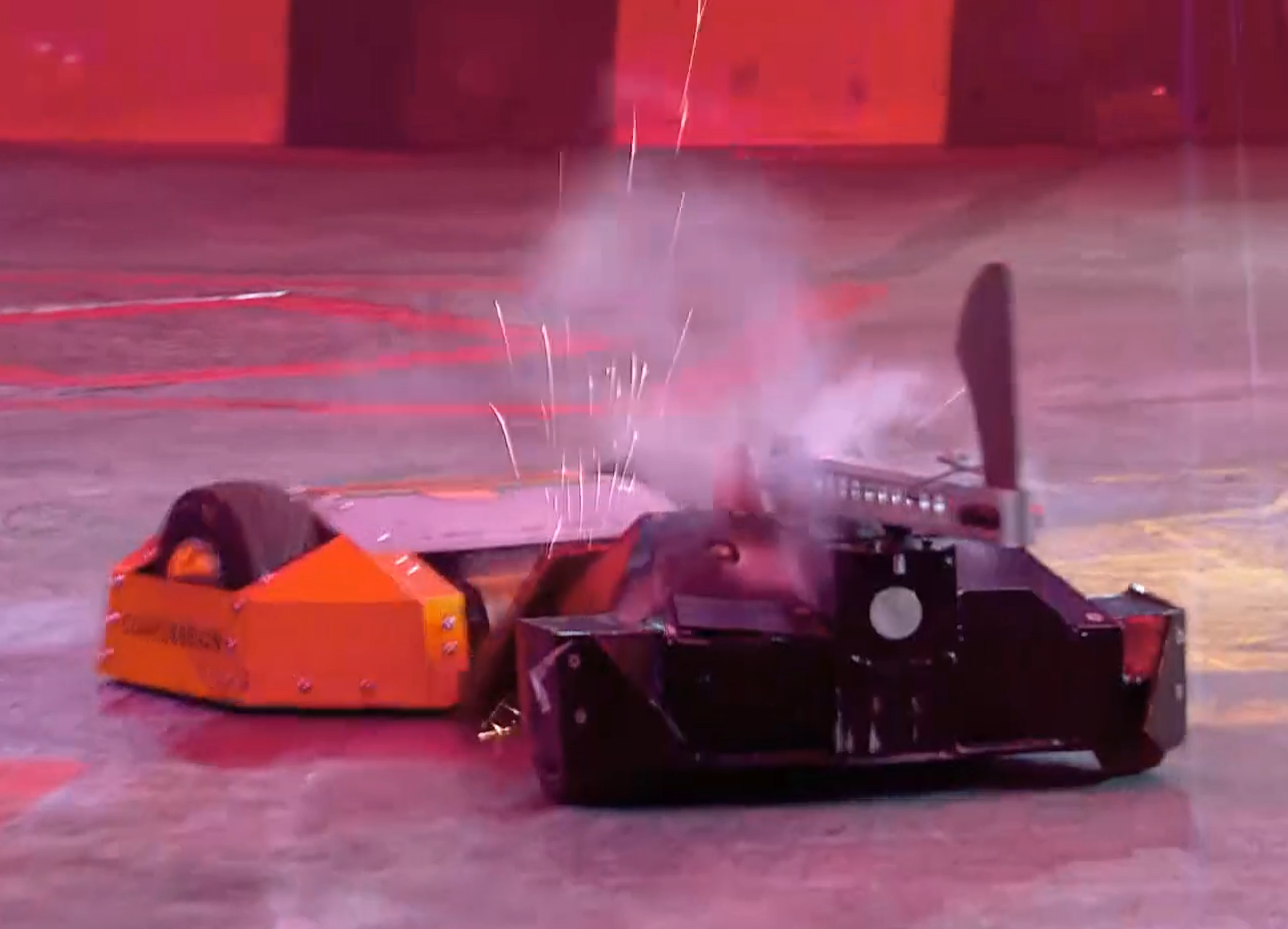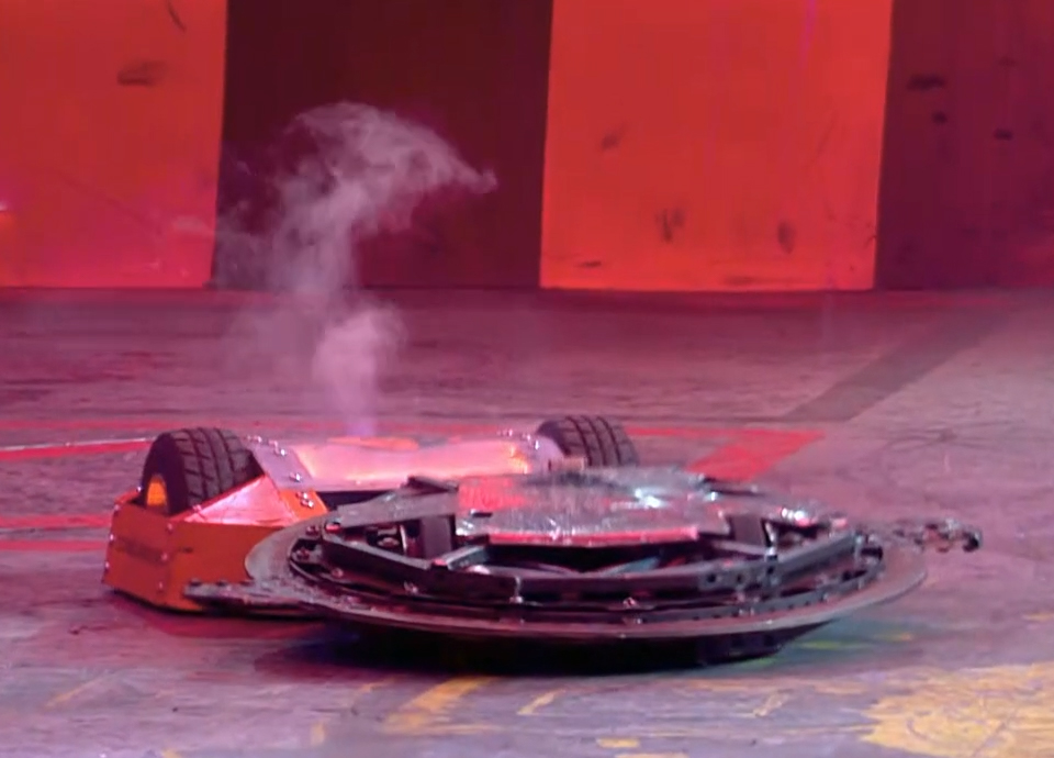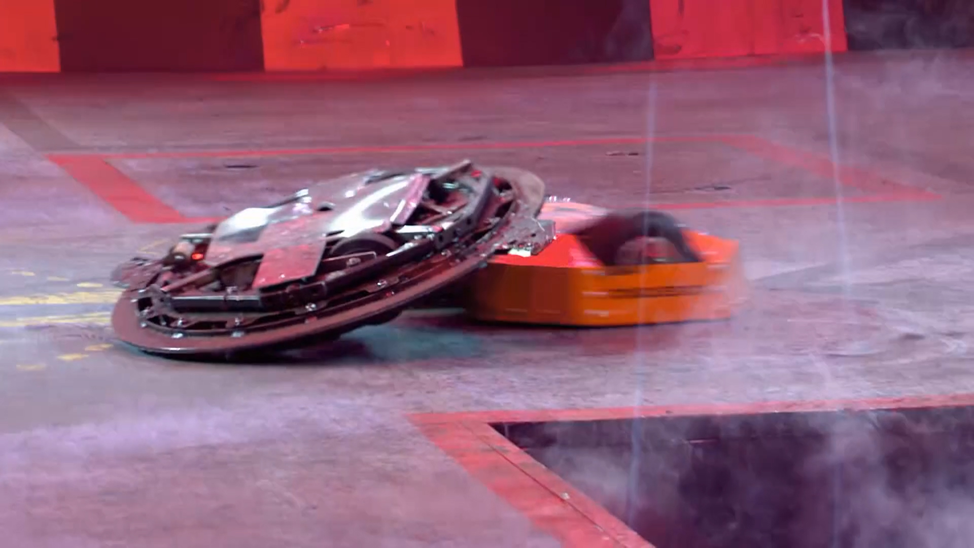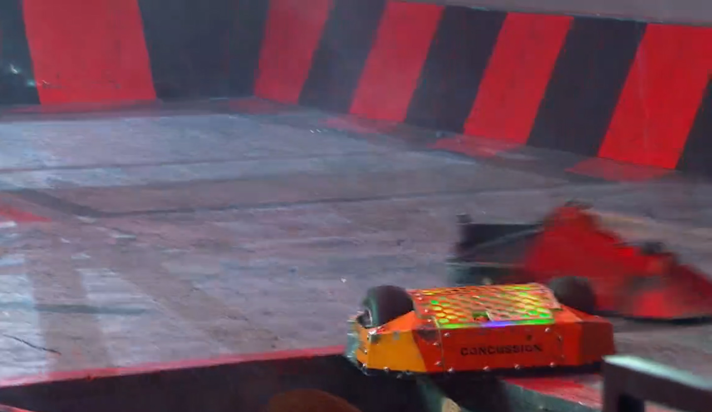 Once M.R. Speed Squared was thrown across the arena by Sir Killalot, Concussion pushed it towards the Pit again, and started smoking as it hit and flipped M.R. Speed Squared a few more times. More smoke billowed as M.R. Speed Squared pushed it back, with Concussion noticeably losing speed and mobility across the arena floor as it tried to retaliate.