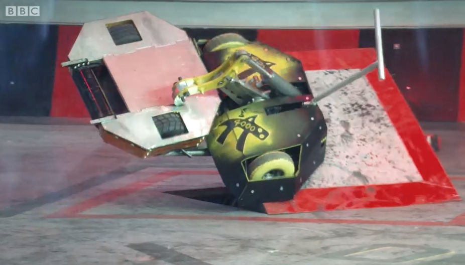 Dead Metal released Concussion from its grasp, where it momentarily hesitated before pursuing and slamming into Thor. Concussion hit Thor a few more times, sending sparks flying and causing CO2 to vent from the latter's axe mechanism, before driving over Thor’s wedge and momentarily lifting off the floor as it did so. Another couple of hits deflected Thor away and sent Concussion onto the partially-lowered Pit panel, leaving it unable to drive away as its ground clearance was too low to drive out of it. Thor slammed into Concussion again, but this impact dislodged one of Concussion's drum belts.[18] Both robots became stuck together as a result, before Thor freed itself using its axe and Concussion spun around on the Pit panel. The House Robot Matilda closed in to try and free Concussion from the Pit - in the edited programme, this was disguised as a Rogue House Robot attack - but instead Matilda became stuck on top of Concussion.