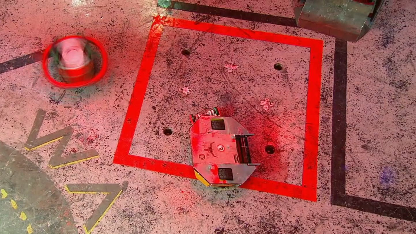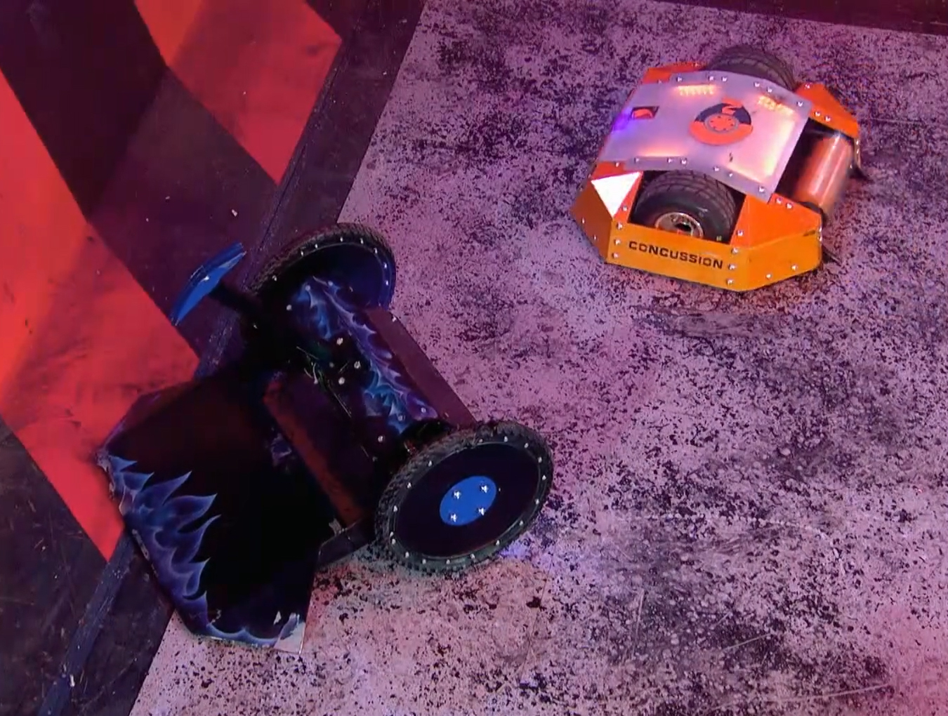 Still smoking, Concussion was rammed again by M.R. Speed Squared, and spun itself and its drum in an attempt to display its remaining signs of mobility. Despite this, it managed to hit M.R. Speed Squared twice more before 'cease' was called and survived to a Judges' decision. Even with its reduced mobility, the decision went unanimously in favour of Concussion, awarding it two points and first place on the leaderboard with eight points. Even with continuing repairs and uncertainties surrounding the reliability of its left-hand drive motor, this result confirmed Concussion's place in the Heat Final, where it faced Thor once again.