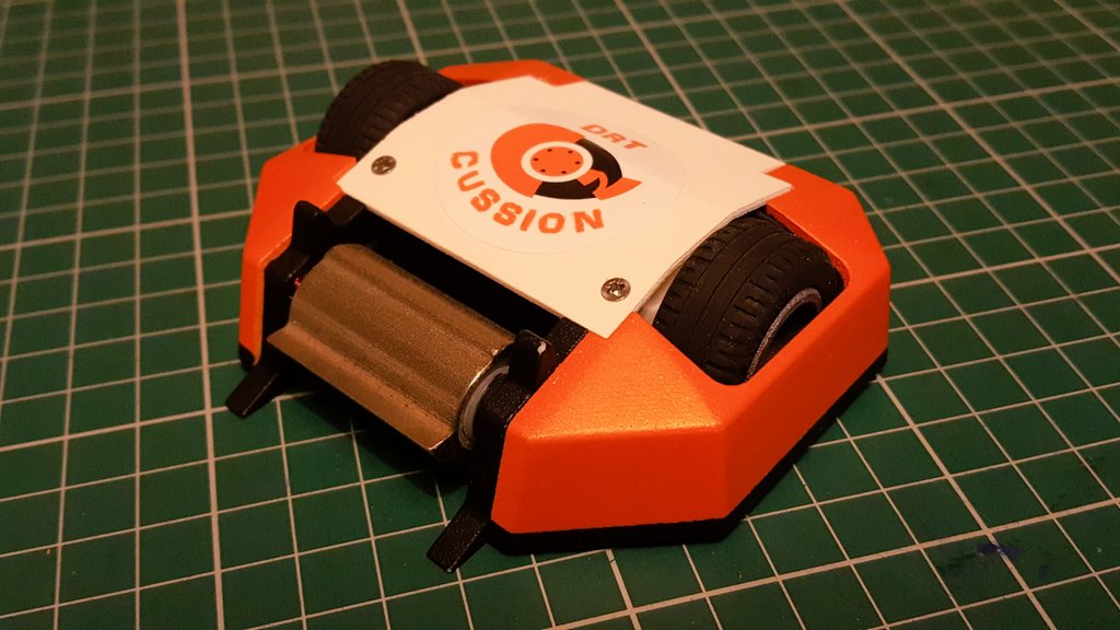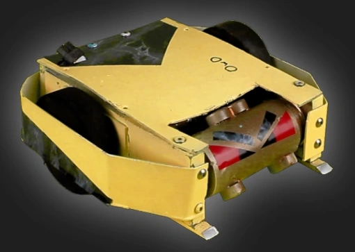 Concussion was a compact, two-wheel drive robot armed with a single-toothed, teardrop-shaped spinning drum. The drum was initially machined out of a single piece of EN8 carbon steel[1], revolving at 6,000rpm and weighing 24.5kg in Series 9. The tooth was designed by team member Sam Griffin, with the Dorset Roboteering Team prioritising a weapon which was well-balanced but had greater engagement on the tooth. Like other drum spinners such as Pulsar and the Series 9-10 versions of Sabretooth, Concussion was capable of running inverted, which it could do so through its 10-inch diameter go-kart wheels.[2] The robot itself was predominantly painted orange and white, with black accents on the drum and front wedgelets. Concussion’s name was painted on the side and rear panels in black, with its logo also featured on the top panel.