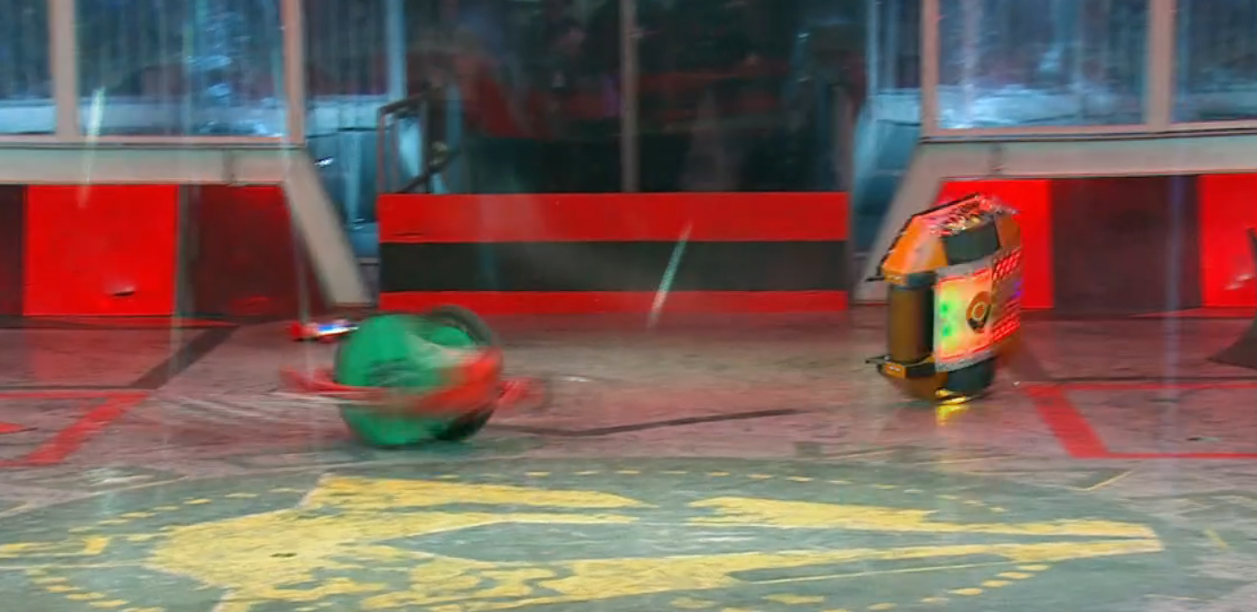 At the start, Concussion immediately lunged at Tauron, but missed, only to slam into Tauron’s side and immobilise it. Seconds later, it flipped Chimera2 over, before chasing Chimera2 as it drove over the arena spikes. Chimera2 pushed Concussion back before Concussion spun away and hit its wedge. Concussion drove away as Thor axed Chimera2, before pushing Chimera2 into the CPZ and getting underneath it as Thor charged in to separate the two robots. A slam from Thor freed Concussion, allowing Concussion to hit its side twice with the drum as Chimera2 was counted out. As a result, Concussion progressed to the Head-to-Head round along with Thor, although not without losing drive to one side as a result of a burnt-out motor.
