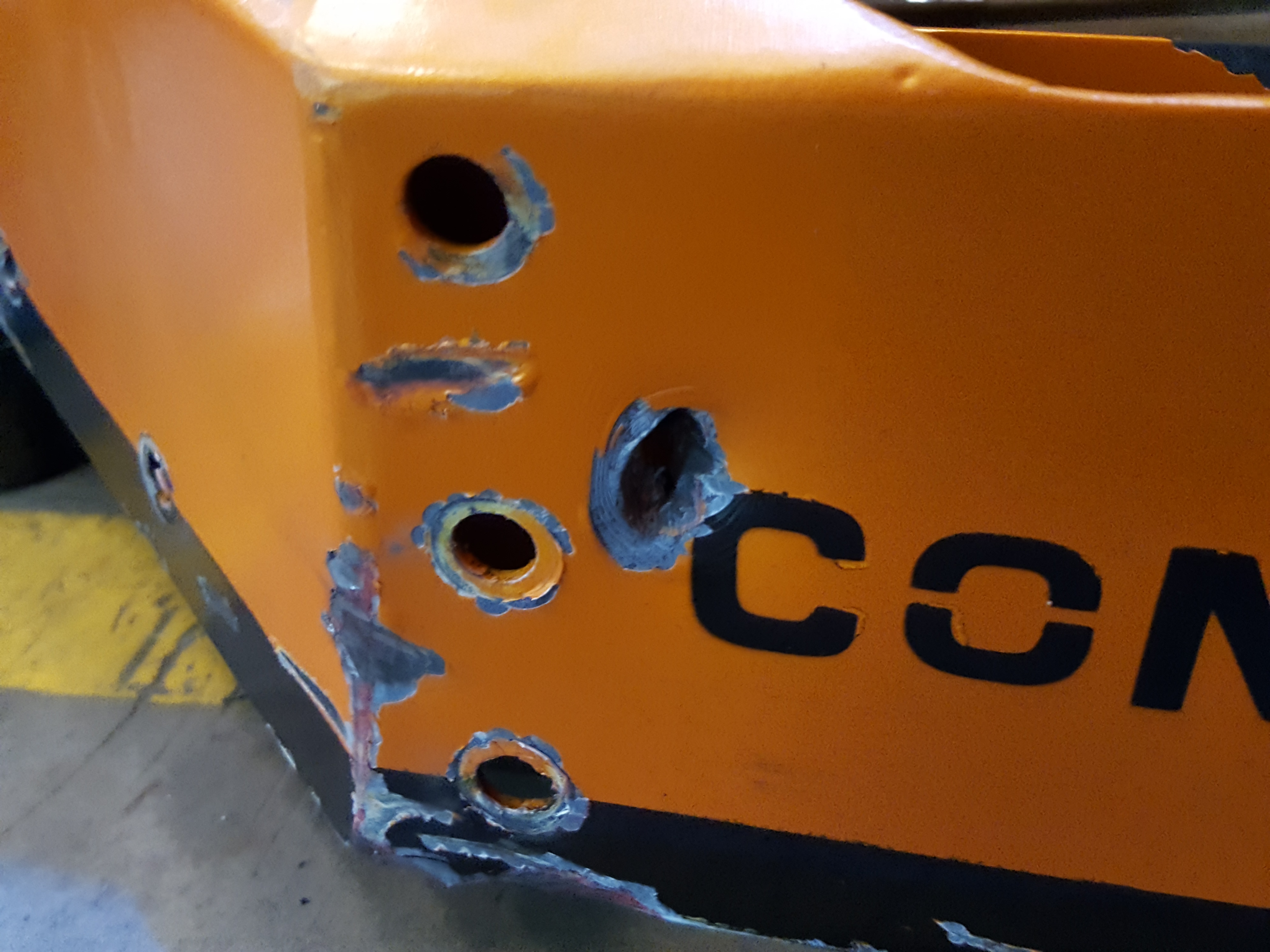Concussion's chassis consisted of a welded frame made out of S355 steel, the same grade as used in forklift truck arms.[3] The robot's armour in Series 9 consisted of various materials, including 3.2mm RAEX, a 10mm polycarbonate top panel and a 3mm aluminium baseplate.[4] The design also incorporated a steep angular wedge profile at the rear - similar to that of Carbide - as well as two narrow front wedgelets used to expose the ground clearance of Concussion's opponents. Notably, the team 3D-printed their own removable link to reduce the chances of the link falling out during battle.[5] Concussion was specifically designed to be serviceable from any angle, in order to allow Dorset Roboteering Team to repair the robot as quickly as possible in between battles.[6] The Series 9 Concussion was powered by a pair of 750W electric motors, although these were susceptible to burning out along with the robot's speed controllers. Additionally, the robot's go-kart wheels were exposed to overhead attacks, and the tooth design on the original drum was susceptible to chipping, reducing the weapon's efficiency over time.