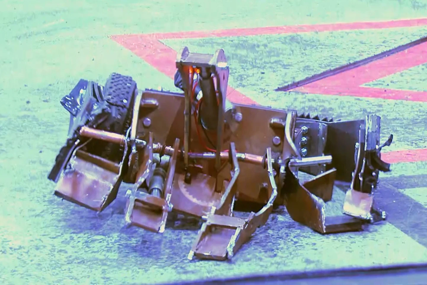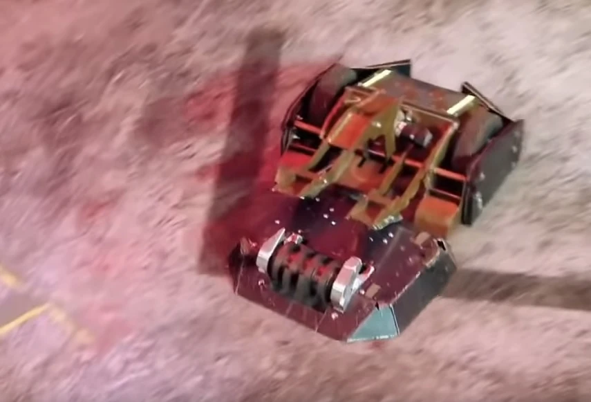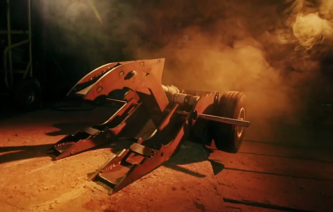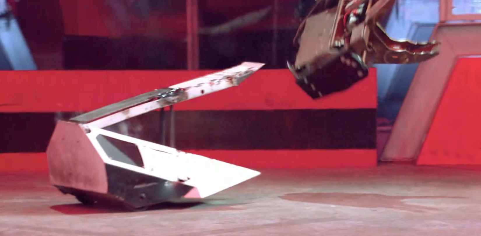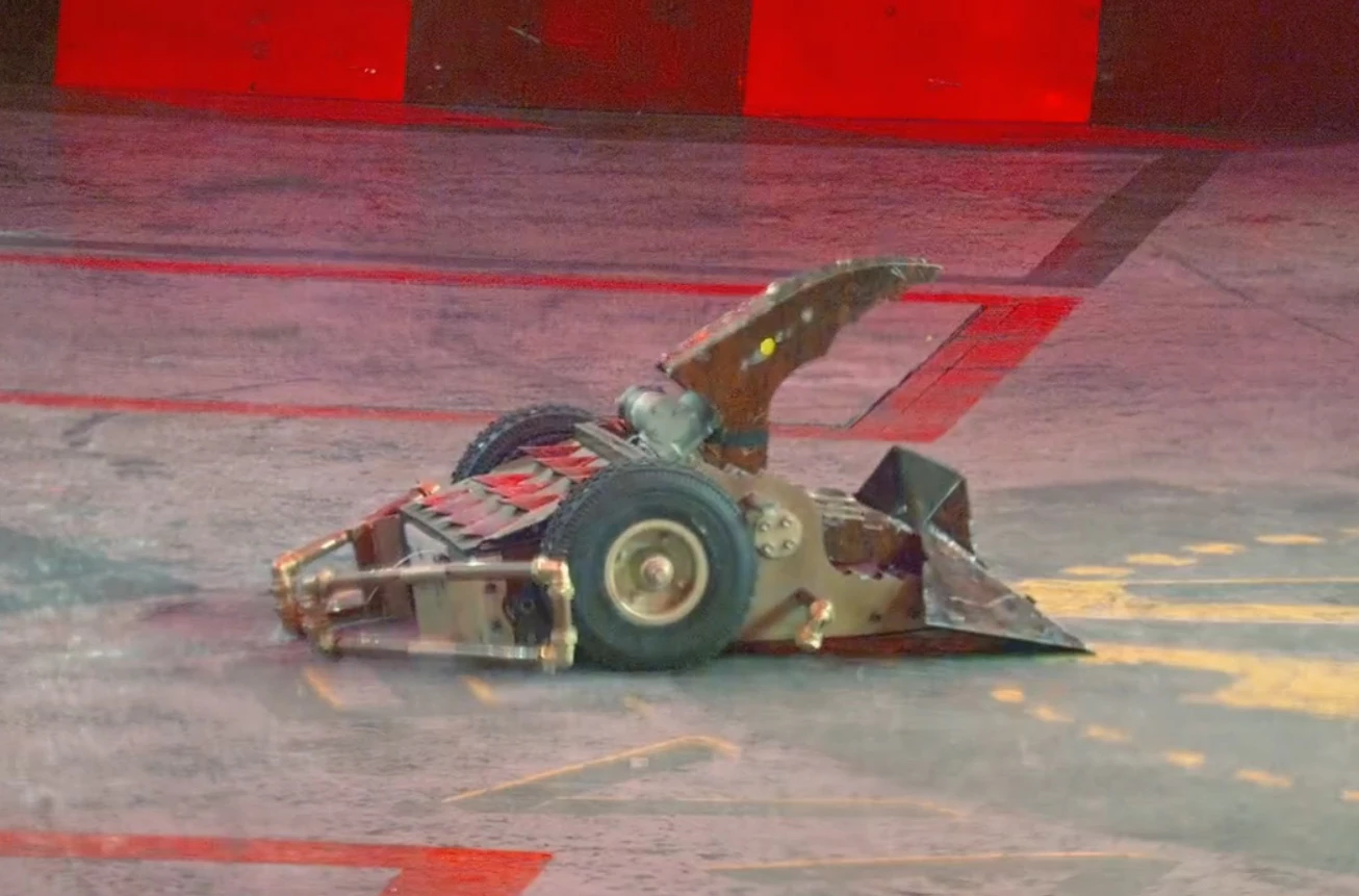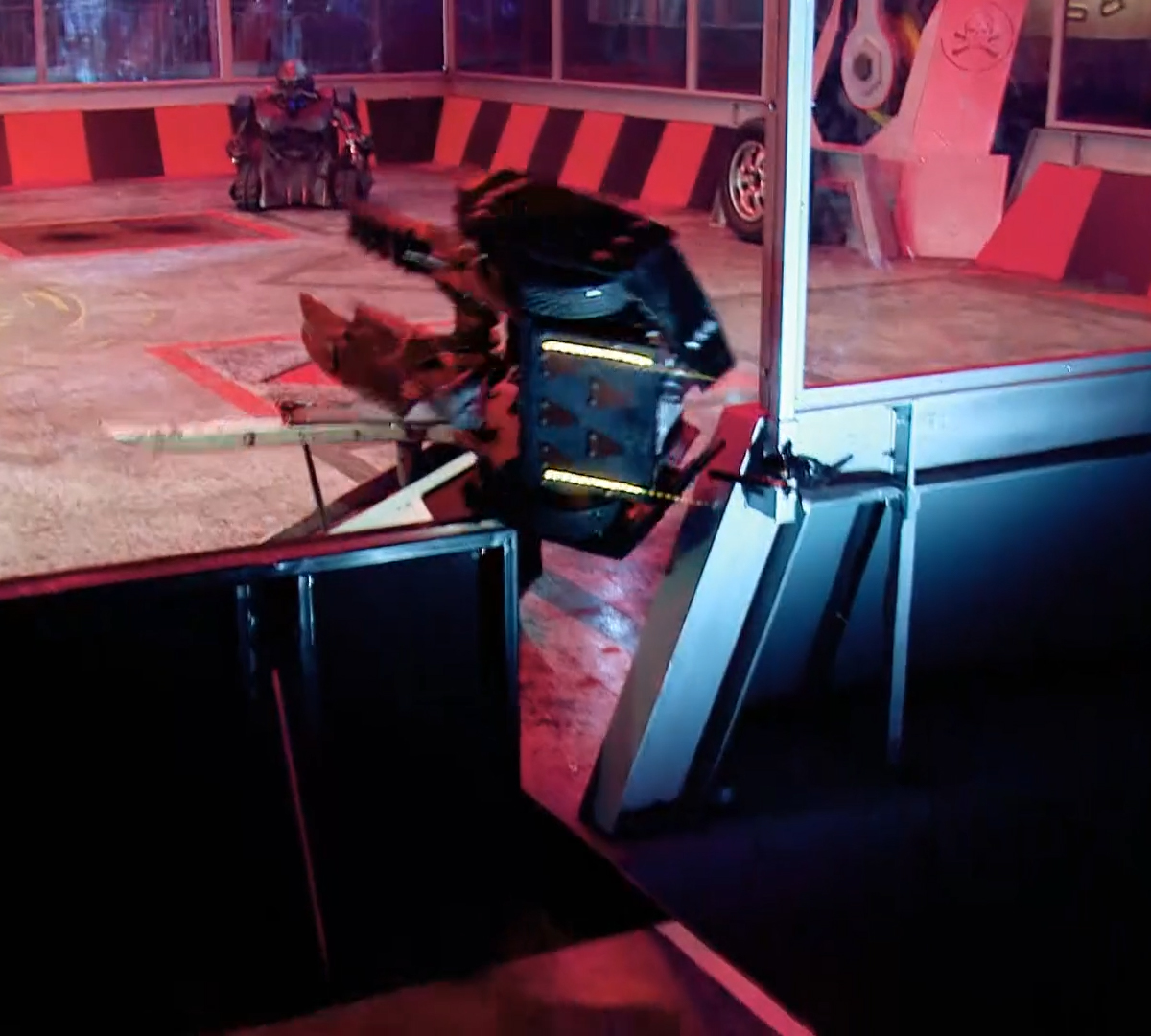 Coyote moved to its left to clamp down onto Smash and drove it into the arena side gate, before turning and moving it into the claws of Dead Metal, a backup plan after realising in this moment that Coyote could not both grab and lift its opponent at the same time[17]. After taking damage from the House Robot, Smash came in with a ram on Coyote and attempted to force it into Dead Metal, although Coyote spun away and Smash was caught once again. Coyote then decided to activate the Arena Tyre, which called Dead Metal into the action, and Smash was placed onto the Flame Pit. Smash then moved away and drove over the top of its teammate, Crackers, which finally got involved and slipped underneath the side of Coyote. Smash took its turn at pressing the Arena Tyre, which signalled Rogue House Robot mode again. This time, it was the turn of Matilda to attack, and Coyote was forced to weather a hit from the House Robot's flywheel on its jaws.