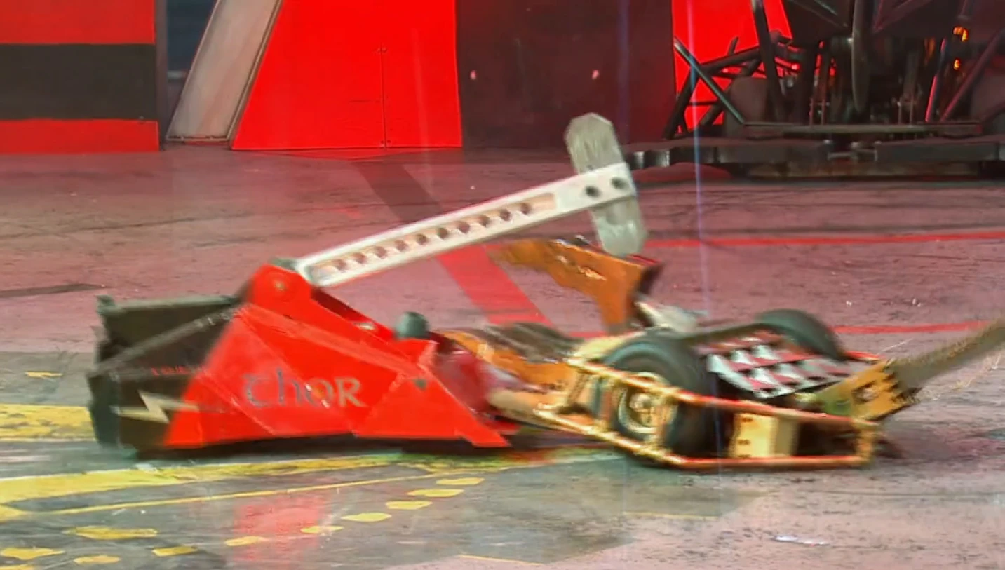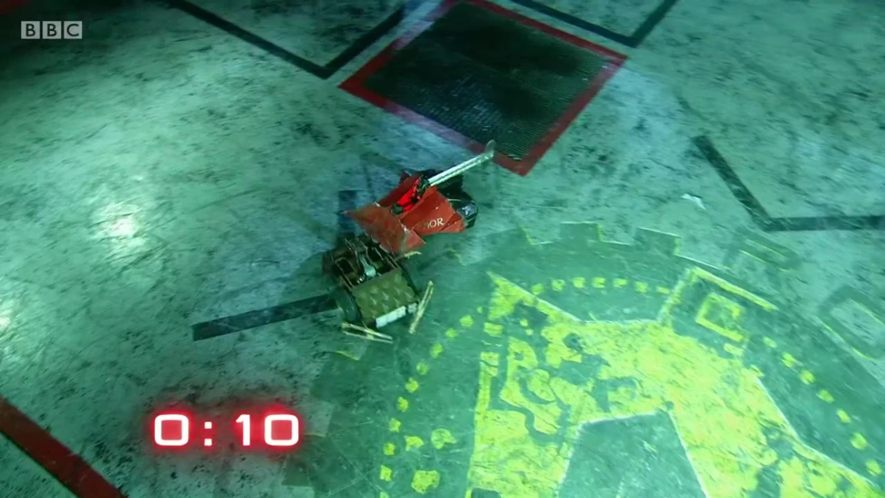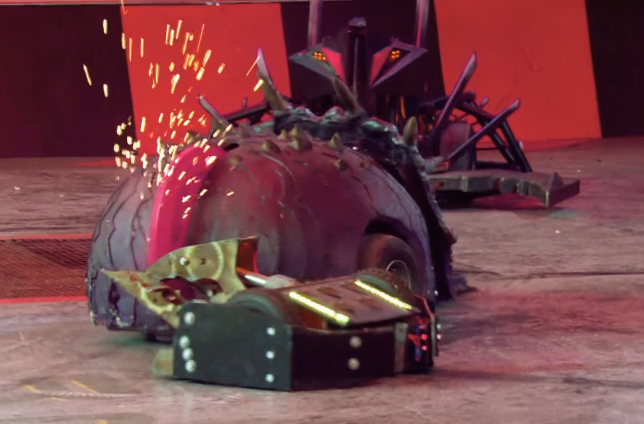 Coyote found itself stuck between Apollo and Sir Killalot for a period, before it was stacked up against the arena gate, and with Coyote unable to move, Apollo followed up with another flip, which sent Coyote over the arena wall and down into the trench.