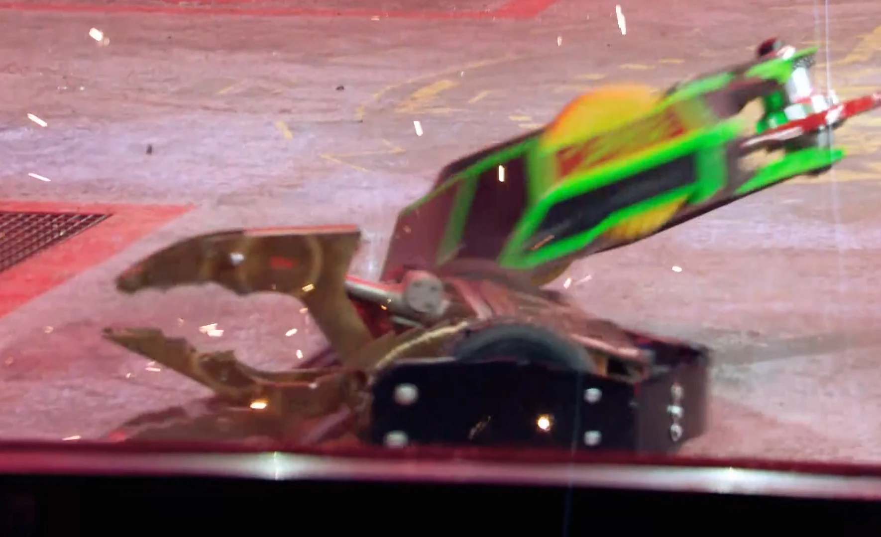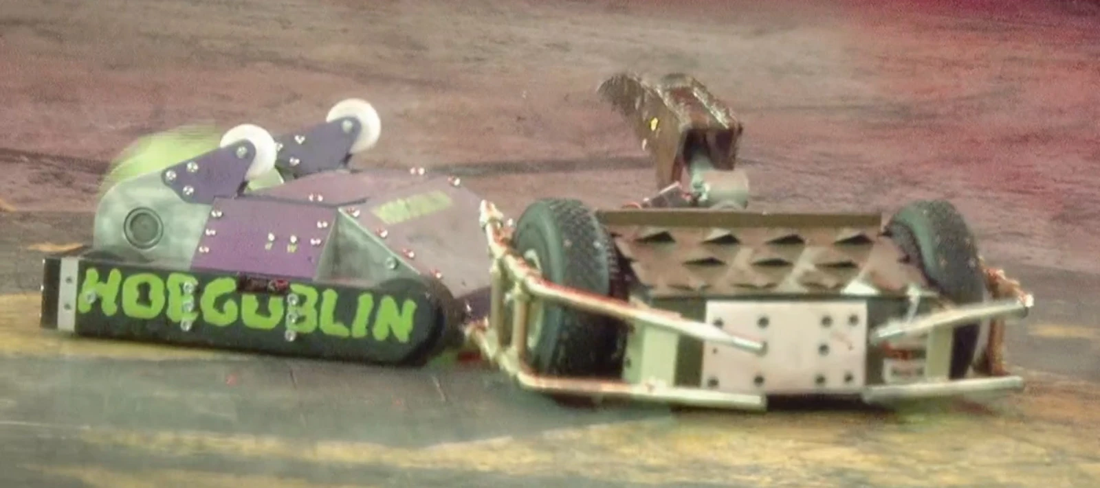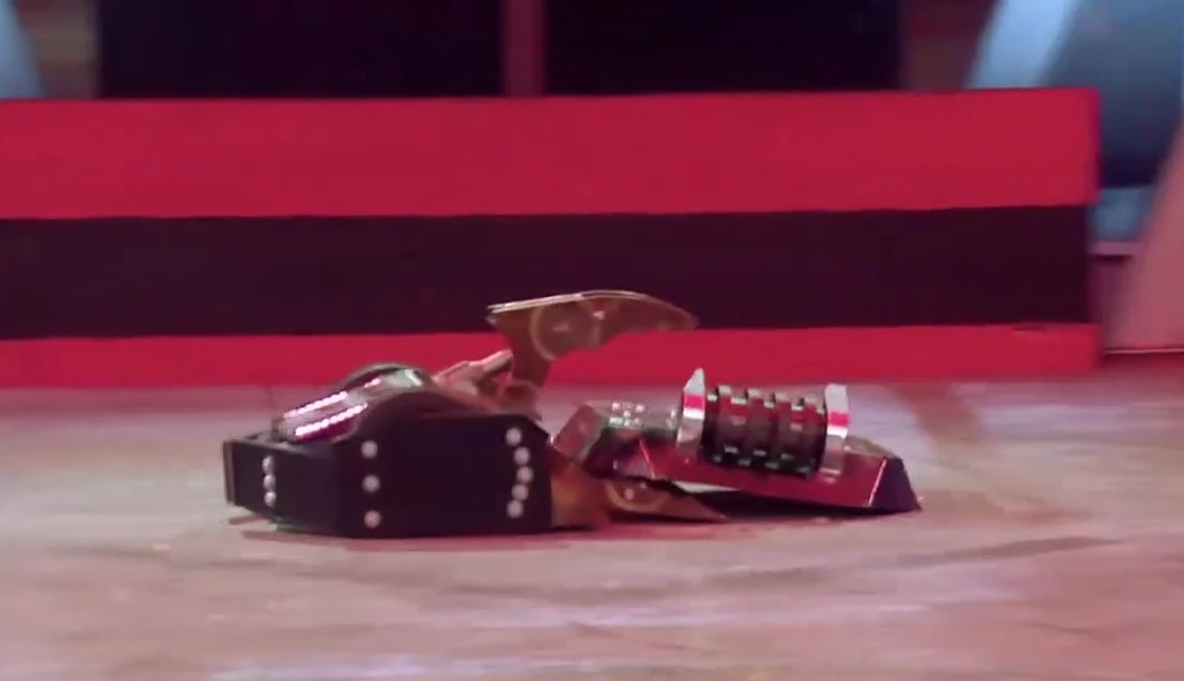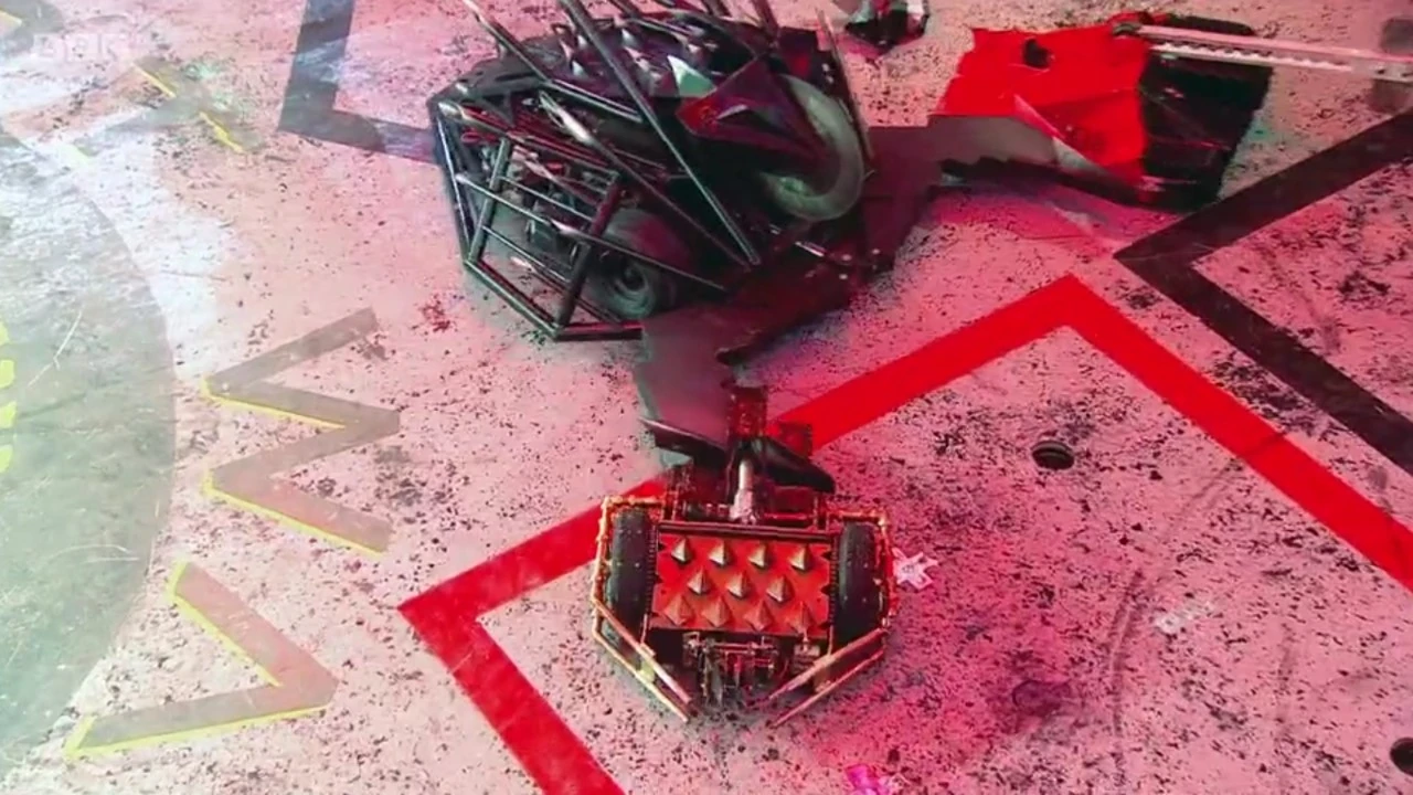 Coyote found itself stuck between Apollo and Sir Killalot for a period, before it was stacked up against the arena gate, and with Coyote unable to move, Apollo followed up with another flip, which sent Coyote over the arena wall and down into the trench.