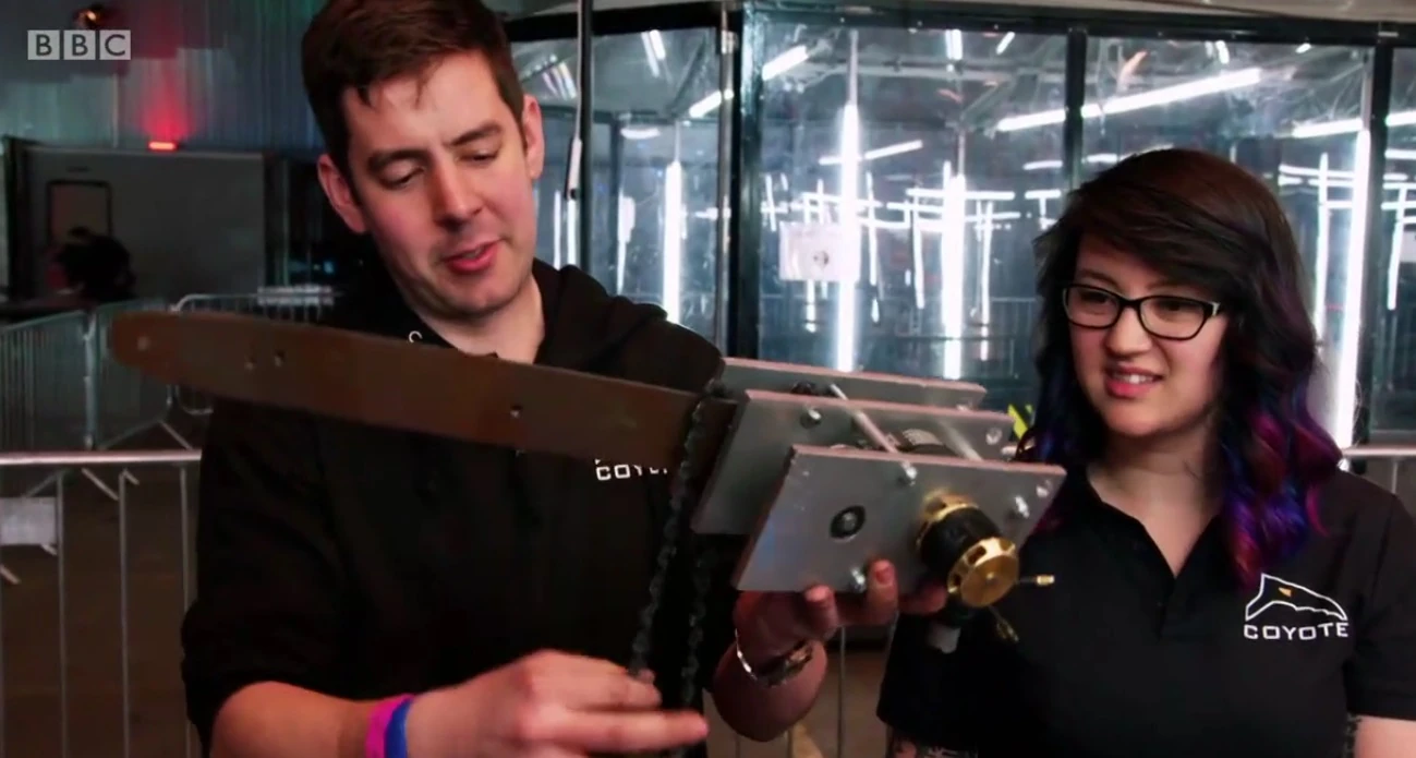 - "One of the main aims of Coyote was to capture the creativity and feel of the robots from the early days of the show, but with the ability to withstand modern combat. Nothing says old-school Robot Wars more than a chainsaw protruding from a robot! This gem was picked up on eBay for £10, listed as not working. Turns out all it needed was a fuse and it was good to go. Howver {sic} due to its size and 240V AC supply, it would need a custom gearbox designed for it to be usable on our robot."