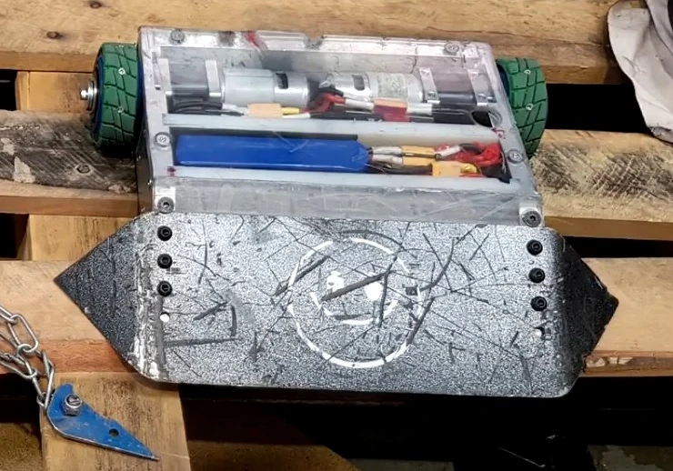 The robot was driven by a 22.2 Volt Lithium-Polymer battery, driving Bosch 750w motors in Series 9, which gave the robot a good top speed of 15mph[2] The robot had six speed controllers, two Victor 883s for the drive, three Turnigy TZ-85 brushless motor controllers to power the actuators (two in the jaw, one on the chainsaw) and a Hobbywing EZRun 150A brushless speed controller to drive the chainsaw[3]. The chassis was constructed from Hardox 450, with the team sending their CAD plans to a cutting company to make the parts, then welding them together[4]. The robot had 5mm steel plate side armour, reinforced by 10mm HDPE, and an aluminium top plate, also reinforced with 10mm HDPE[5].