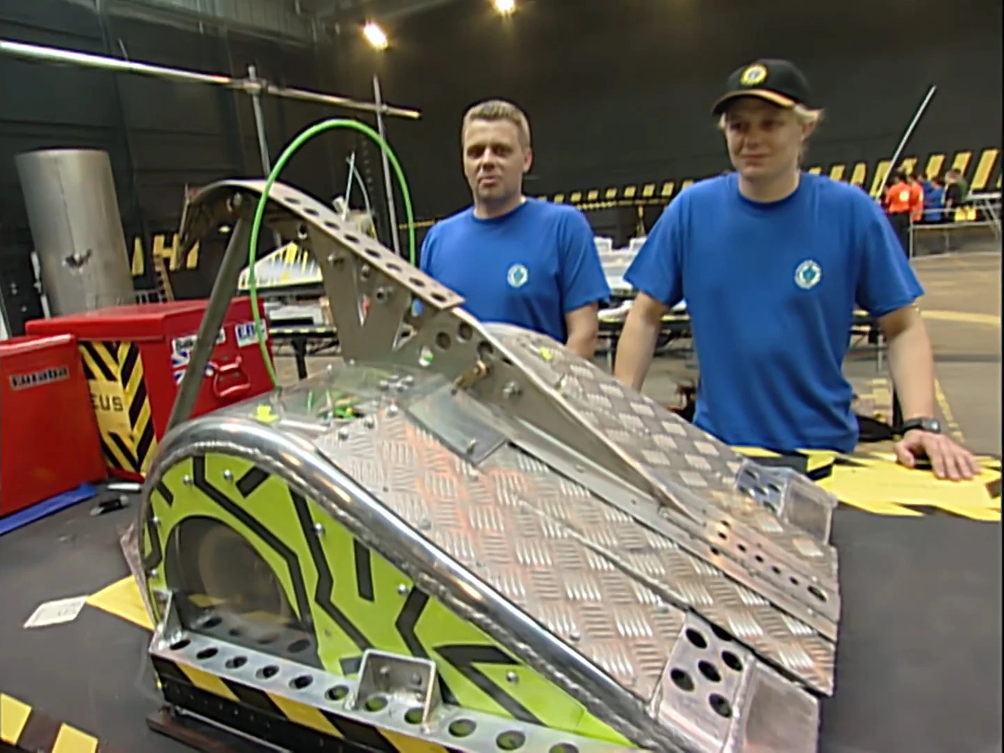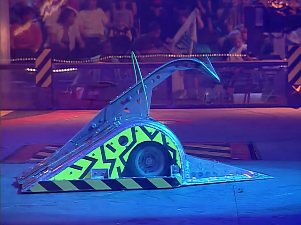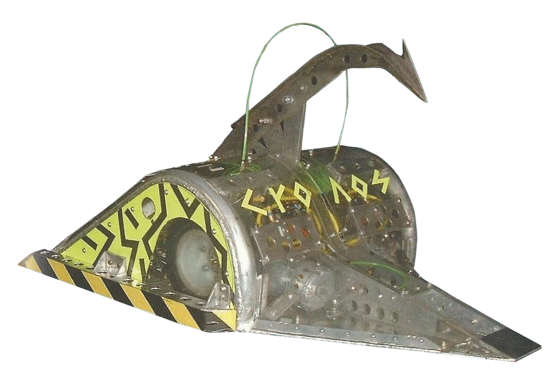 Cronos was a reverse wedge-shaped robot weighing 80.3kg - the heaviest in its heat - and made out of parts from a dry-cleaner. Its weapon was an unusual pneumatic lifter/crushing arm powered by airbags, with the arm featuring a spiked tip and being capable of crushing with 7500kg of force when lowered. When raised, the lifter portion of the weapon was capable of lifting a double-decker bus.
