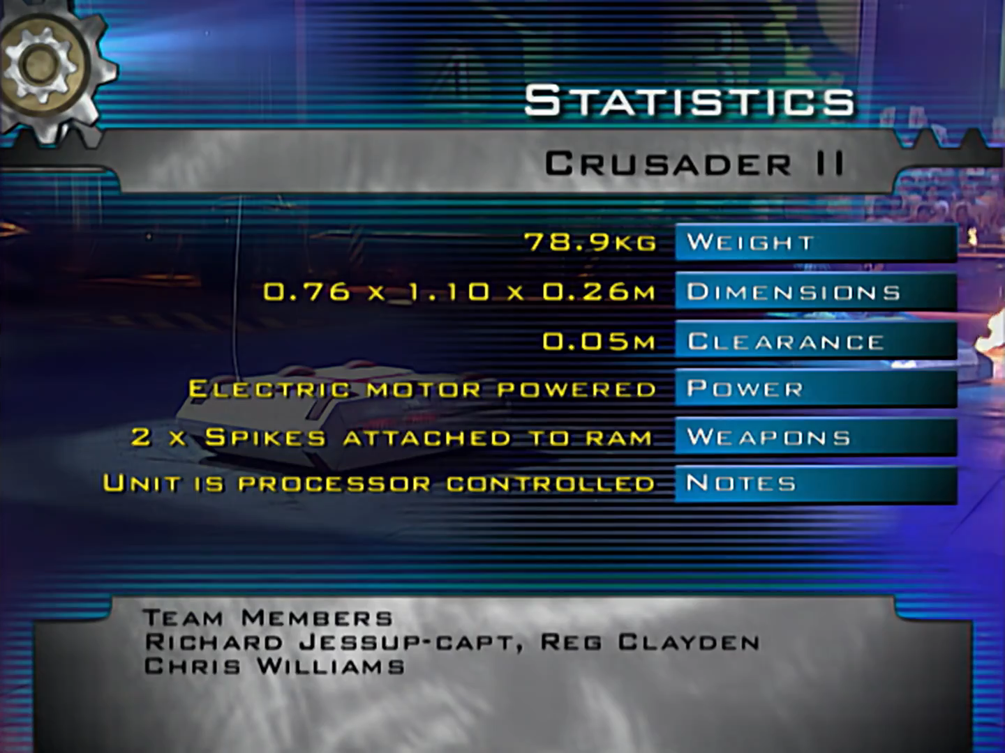Crusader was entered by a team of work colleagues from Essex. Team leader Chris Williams was the only team member to be present in both the team's appearances, though in Series 4, Richard Jessup was the team captain. All of the team members, and various other people who worked on the robots, worked in the Design and Development Department of Printed Forms Equipment[3].