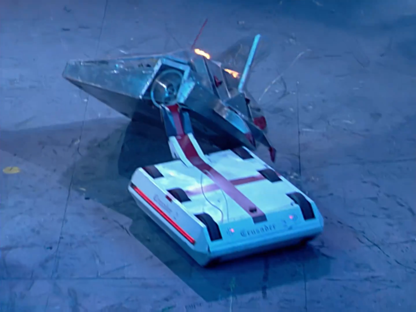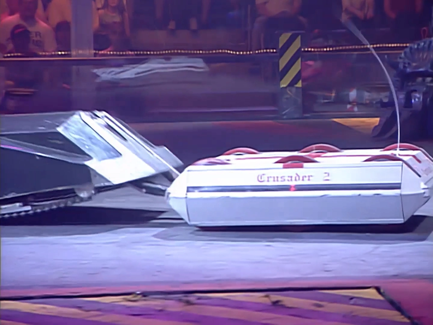 Crusader 2 rammed Cronos along the upper perimeter and into Dead Metal, who grabbed and began cutting into the Southampton entry. With Cronos trapped, it resumed its duel with Steg 2, which saw both competitors stray towards Sergeant Bash. Crusader 2, now with its aerial caught behind the left-rear wheel, drove away safely, while Steg 2 slammed into the nearby wall and got stuck. Taking advantage of Steg 2's predicament, Crusader 2 rammed it once more. Another push and ram followed later on, after Steg 2 was freed, and while Cronos was attacked and sent to the Pit of Oblivion by the House Robots. Crusader 2 slammed Steg 2 into the upper wall opposite Shunt's CPZ, sending a piece of metal flying on impact. 'Cease' was called, with Crusader 2 and Steg 2 both progressing to the Heat Semi-Finals.