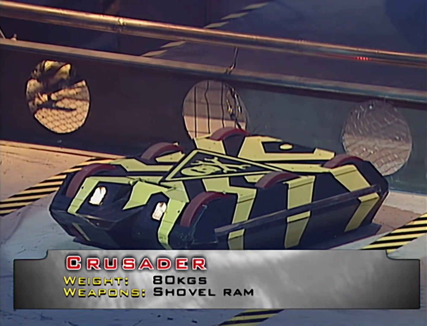 The original Crusader that appeared in Series 3 was painted yellow and black with a hazard sign printed on the top armour, and featured a wider lifting arm. The robot had a steel chassis, polyurethane tyres for extra grip, and two 24V EMD 700W motors. It was powered by two 12V, 16Ah, Dry Fit batteries, and had drive electronics designed by the team, with two drive boards, one for each drive motor, each capable of delivering 100A. The robot also had a 0.8 litres high-pressure air reservoir linked to a 10 Bar first stage regulator which powered the flipper, which the team referred to as a shovel. The shovel had the power to lift around 80Kg in 0.3 seconds to a height of 450mm.
