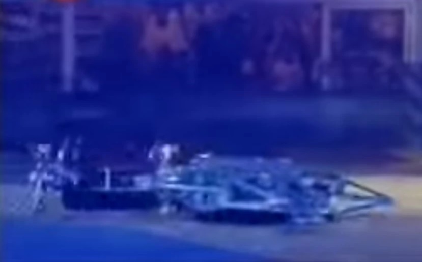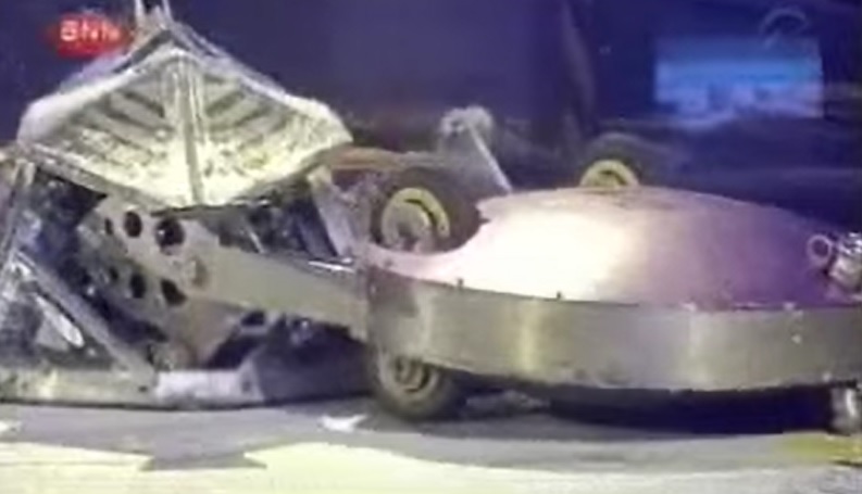 Crushtacean's initial movements were tentative as it crept around in the centre of the arena. Suddenly, Crushtacean turned its rear towards Ironside3 which was fast approaching, and a subsequent hit took a chunk out of Crushtacean and sent it spiralling over the Flame Pit.