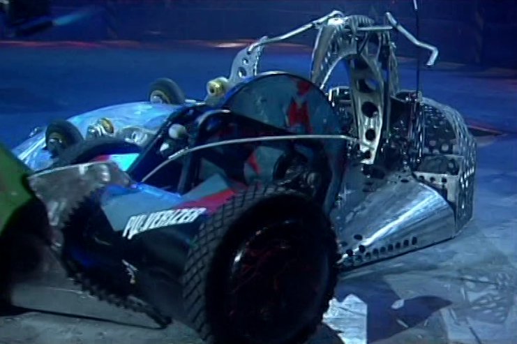 Wheely Big Cheese tried to get under it, but Crushtacean drove off, so Wheely Big Cheese missed. Crushtacean opened the Pit, then drove up the flipper, allowing Wheely Big Cheese to flip it over. After this, Crushtacean reversed, but then stopped. Wheely Big Cheese got under it again, flipping it. Crushtacean reversed, only to stop again, and Wheely Big Cheese got another flip in. This flip caused the aerial to fall off Crushtacean.