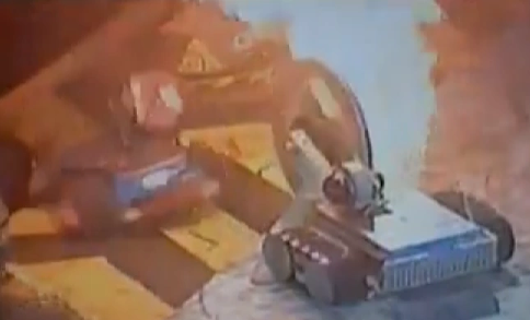 There, Cyclone 2 started even more tentatively, initially chasing after Revenge before driving towards the battling Brute and The Termite. It was briefly pushed back by Revenge and rammed from the rear by The Termite; upon retreating and turning around for an assault, it clipped The Termite and Brute in rapid succession, hurling the latter across the arena. More quick blows on The Termite ripped one of the blue and red machine's wheels off its mount. In doing so, however, Cyclone 2 drove over the flame jet, after which it caught fire and lost power to its disk.