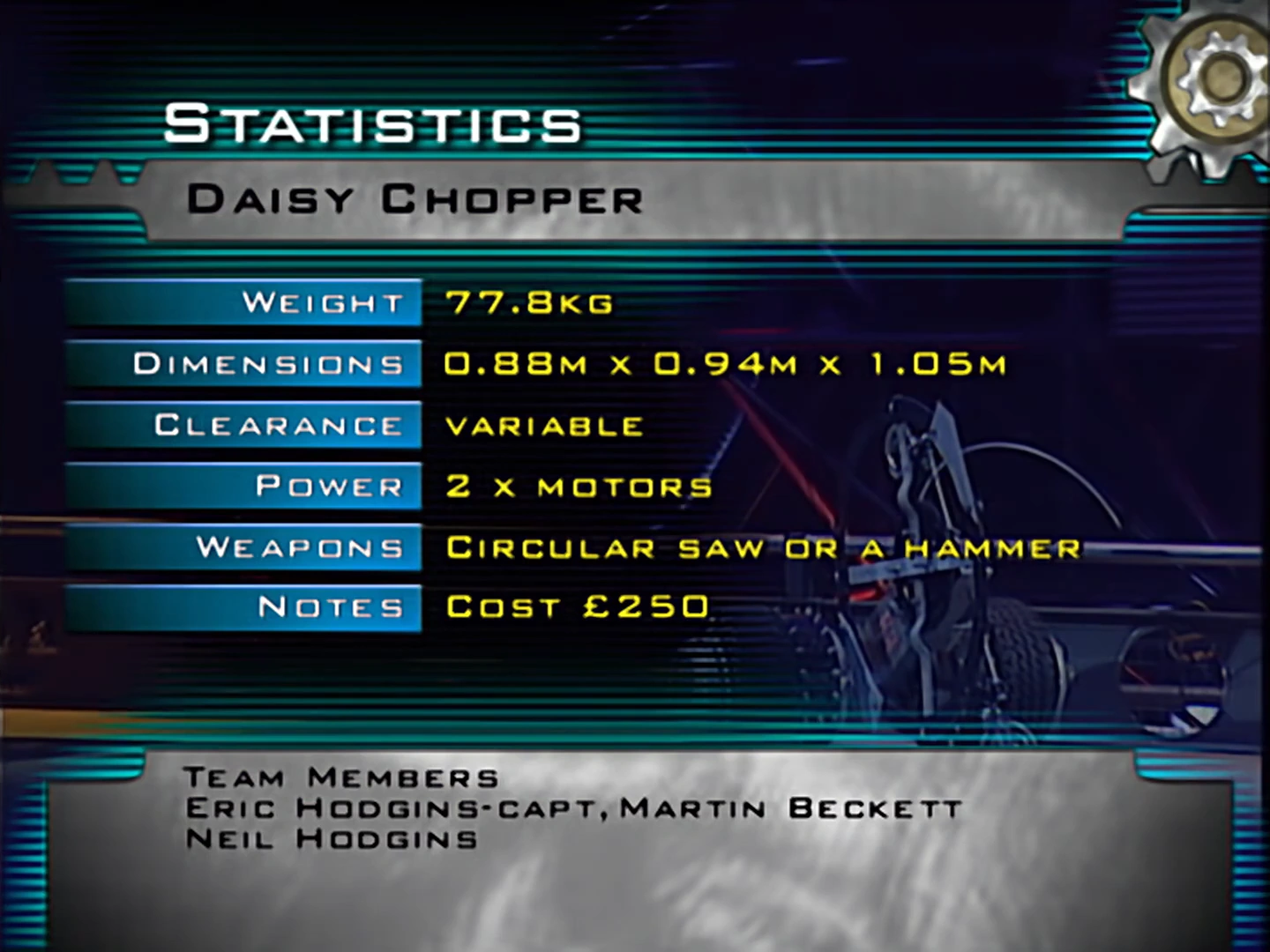 Daisy Chopper was a large, two-wheeled robot with a top speed of 20mph and armed with a large 20kg vertical flywheel as its weapon. The flywheel, which was incorrectly referred to as a "circular saw" or "hammer" on the show, was driven by a starter motor from a hatchback car and spun at up to 600rpm.